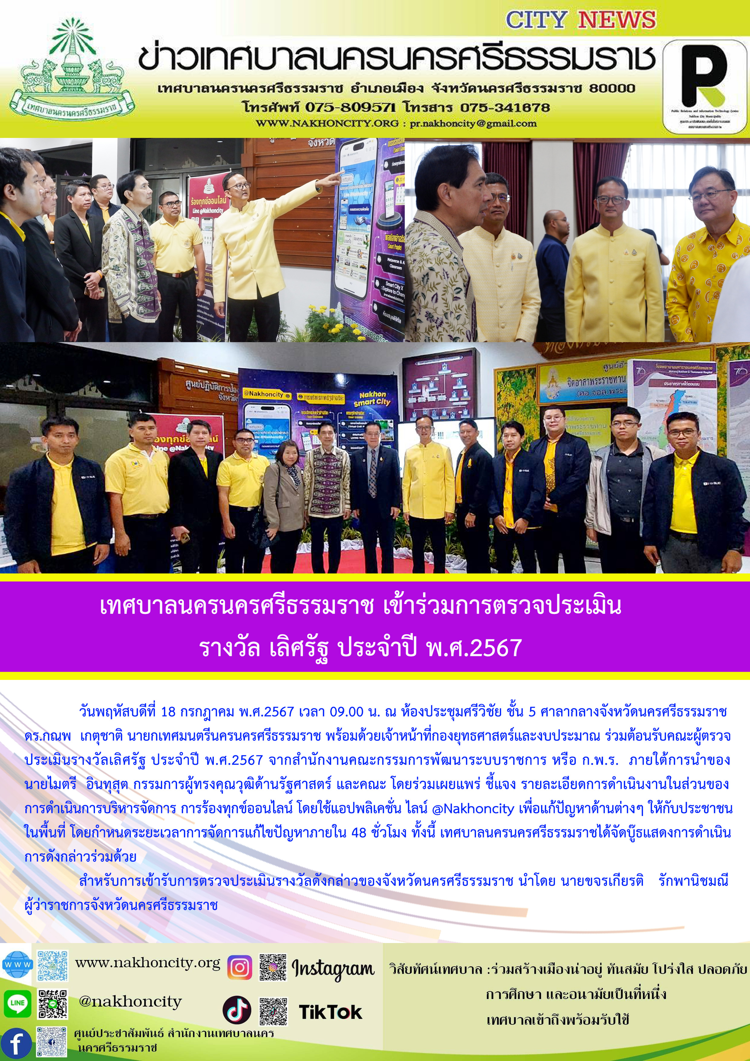 เทศบาลนครนครศรีธรรมราช เข้าร่วมการตรวจประเมินรางวัล เลิศรัฐ ประจำปี พ.ศ.2567 |