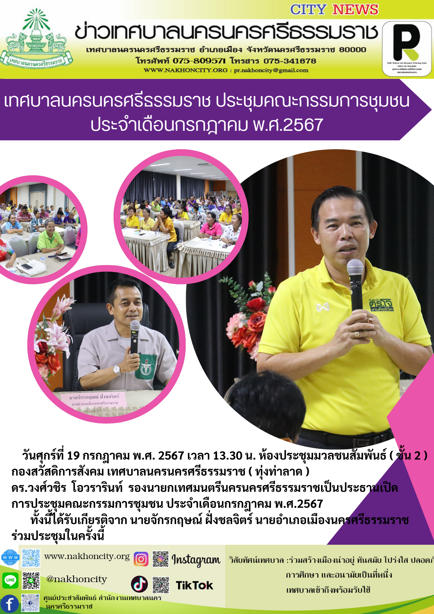ดร.วงศ์วชิร โอวรารินท์ รองนายกเทศมนตรีนครนครศรีธรรมราชเป็นประธานเปิด การประชุมคณะกรรมการชุมชนประจำเดือนกรกฎาคม พ.ศ.2567 |