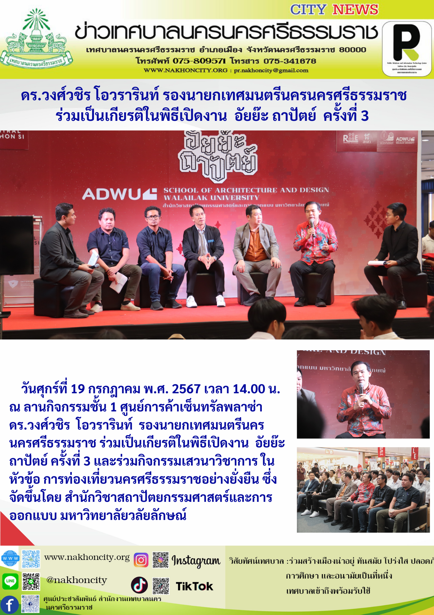 วันศุกร์ที่ 19 กรกฎาคม พ.ศ. 2567 เวลา 14.00 น. ณ ลานกิจกรรมชั้น 1 ศูนย์การค้าเซ็นทรัลพลาซ่า ดร.วงศ์วชิร โอวรารินท์ รองนายกเทศมนตรีนครนครศรีธรรมราช ร่วมเป็นเกียรติในพิธีเปิดงาน อัยย๊ะ ถาปัตย์ ครั้งที่ 3 และร่วมกิจกรรมเสวนาวิชาการ ในหัวข้อ การท่องเที่ยวนครศรีธรรมราชอย่างยั่งยืน ซึ่งจัดขึ้นโดย สำนักวิชาสถาปัตยกรรมศาสตร์และการออกแบบ มหาวิทยาลัยวลัยลักษณ์ |