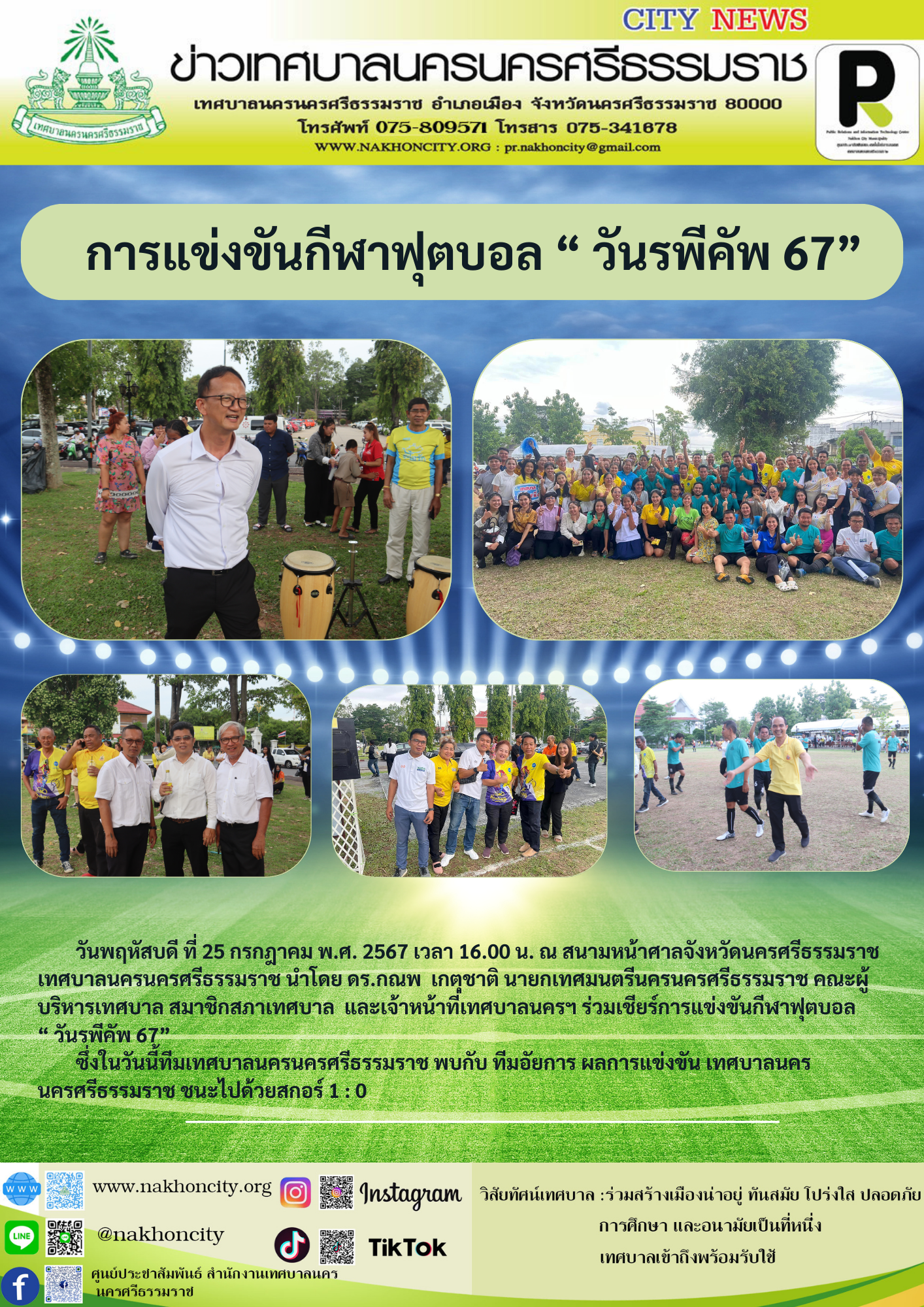 ดร.กณพ เกตุชาติ นายกเทศมนตรีนครนครศรีธรรมราช คณะผู้บริหารเทศบาล สมาชิกสภาเทศบาล และเจ้าหน้าที่เทศบาลนครฯ ร่วมเชียร์การแข่งขันกีฬาฟุตบอล “ วันรพีคัพ 67” |
