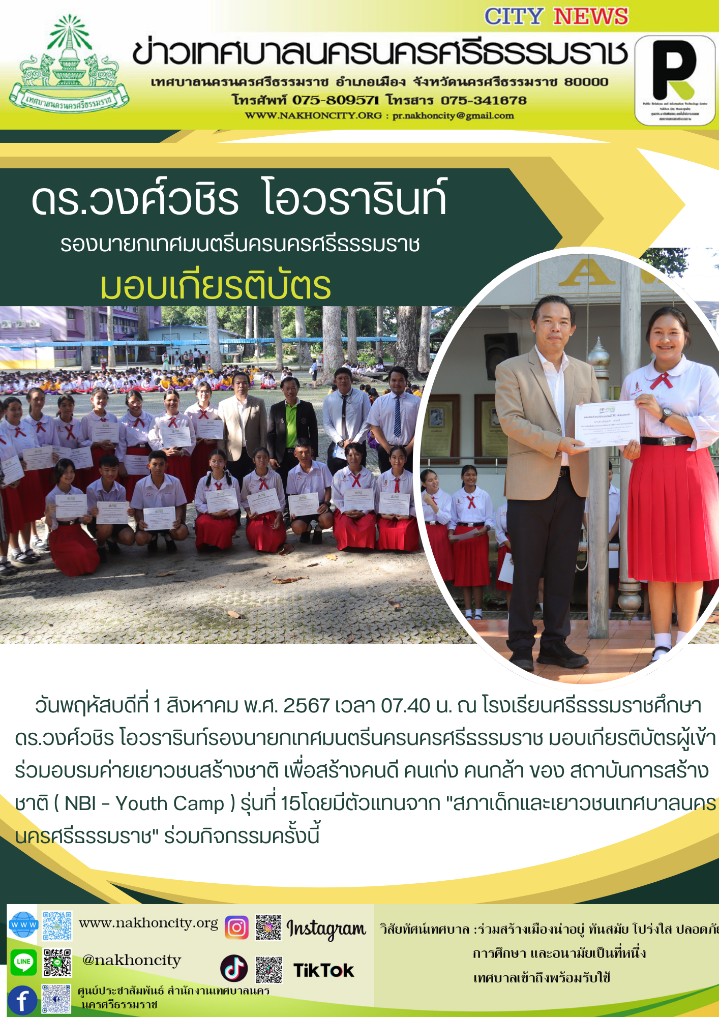 ดร.วงศ์วชิร โอวรารินท์ รองนายกเทศมนตรีนครนครศรีธรรมราช มอบเกียรติบัตรผู้เข้าร่วมอบรมค่ายเยาวชนสร้างชาติ เพื่อสร้างคนดี คนเก่ง คนกล้า ของ สถาบันการสร้างชาติ ( NBI – Youth Camp ) รุ่นที่ 15 |
