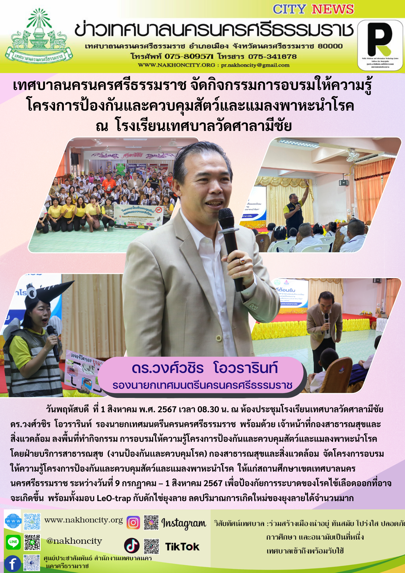 ดร.วงศ์วชิร โอวรารินท์ รองนายกเทศมนตรีนครนครศรีธรรมราช พร้อมด้วย เจ้าหน้าที่กองสาธารณสุขและสิ่งแวดล้อม ลงพื้นที่ทำกิจกรรม การอบรมให้ความรู้โครงการป้องกันและควบคุมสัตว์และแมลงพาหะนำโรค |