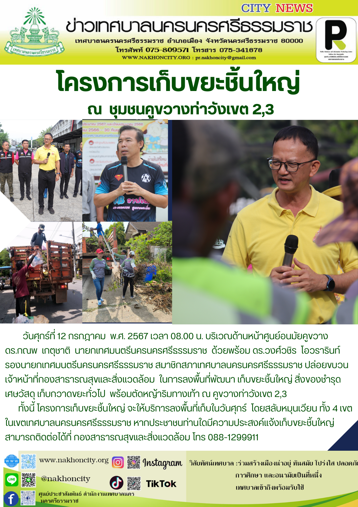 วันศุกร์ที่ 12 กรกฎาคม พ.ศ. 2567 เวลา 08.00 น. บริเวณด้านหน้าศูนย์อนมัยคูขวาง ดร.กณพ เกตุชาติ นายกเทศมนตรีนครนครศรีธรรมราช ด้วยพร้อม ดร.วงศ์วชิร โอวรารินท์ รองนายกเทศมนตรีนครนครศรีธรรมราช สมาชิกสภาเทศบาลนครนครศรีธรรมราช ปล่อยขบวนเจ้าหน้าที่กองสาธารณสุขและสิ่งแวดล้อม ในการลงพื้นที่พัฒนา เก็บขยะชิ้นใหญ่ สิ่งของชำรุดเศษวัสดุ เก็บกวาดขยะทั่วไป พร้อมตัดหญ้าริมทางเท้า ณ คูขวางท่าวังเขต 2,3 ทั้งนี้ โครงการเก็บขยะชิ้นใหญ่ จะให้บริการลงพื้นที่เก็บในวันศุกร์ โดยสลับหมุนเวียน ทั้ง 4 เขต ในเขตเทศบาลนครนครศรีธรรมราช หากประชาชนท่านใดมีความประสงค์แจ้งเก็บขยะชิ้นใหญ่ สามารถติดต่อได้ที่ กองสาธารณสุขและสิ่งแวดล้อม โทร 088-1299911 |