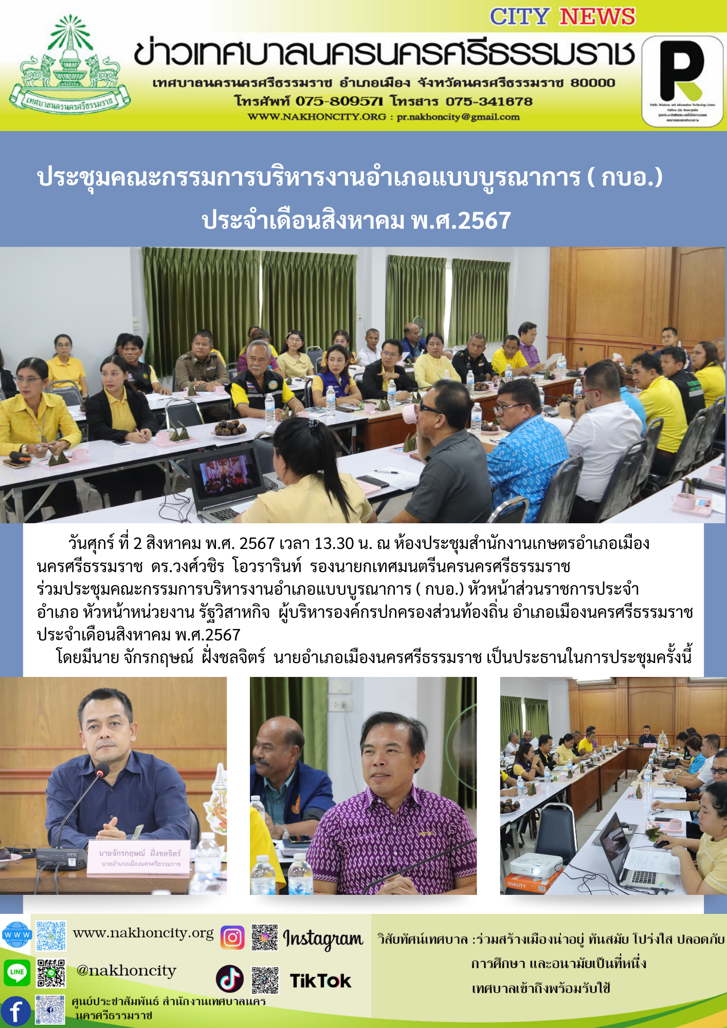 ดร.วงศ์วชิร โอวรารินท์ รองนายกเทศมนตรีนครนครศรีธรรมราช พร้อมด้วย ร่วมประชุมคณะกรรมการบริหารงานอำเภอแบบบูรณาการ ( กบอ.) หัวหน้าส่วนราชการประจำอำเภอ หัวหน้าหน่วยงาน รัฐวิสาหกิจ ผู้บริหารองค์กรปกครองส่วนท้องถิ่น อำเภอเมืองนครศรีธรรมราช ประจำเดือนสิงหาคม พ.ศ.2567 |