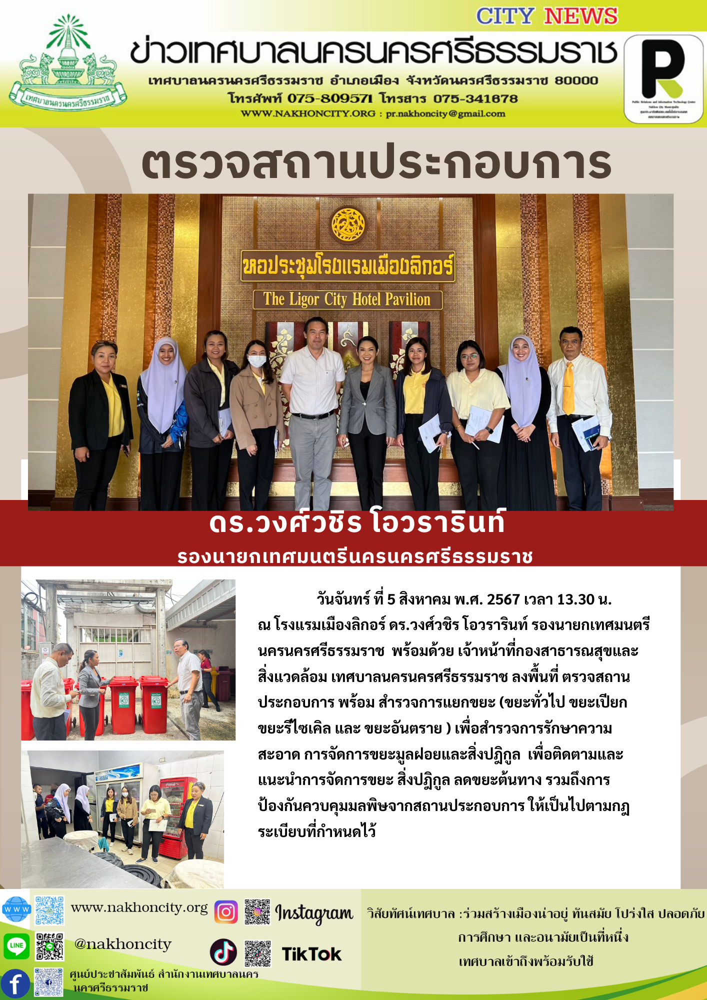 ดร.วงศ์วชิร โอวรารินท์ รองนายกเทศมนตรีนครนครศรีธรรมราช พร้อมด้วย เจ้าหน้าที่ กองสาธารณสุขและสิ่งแวดล้อม เทศบาลนครนครศรีธรรมราช ลงพื้นที่ ตรวจสถานประกอบการ |