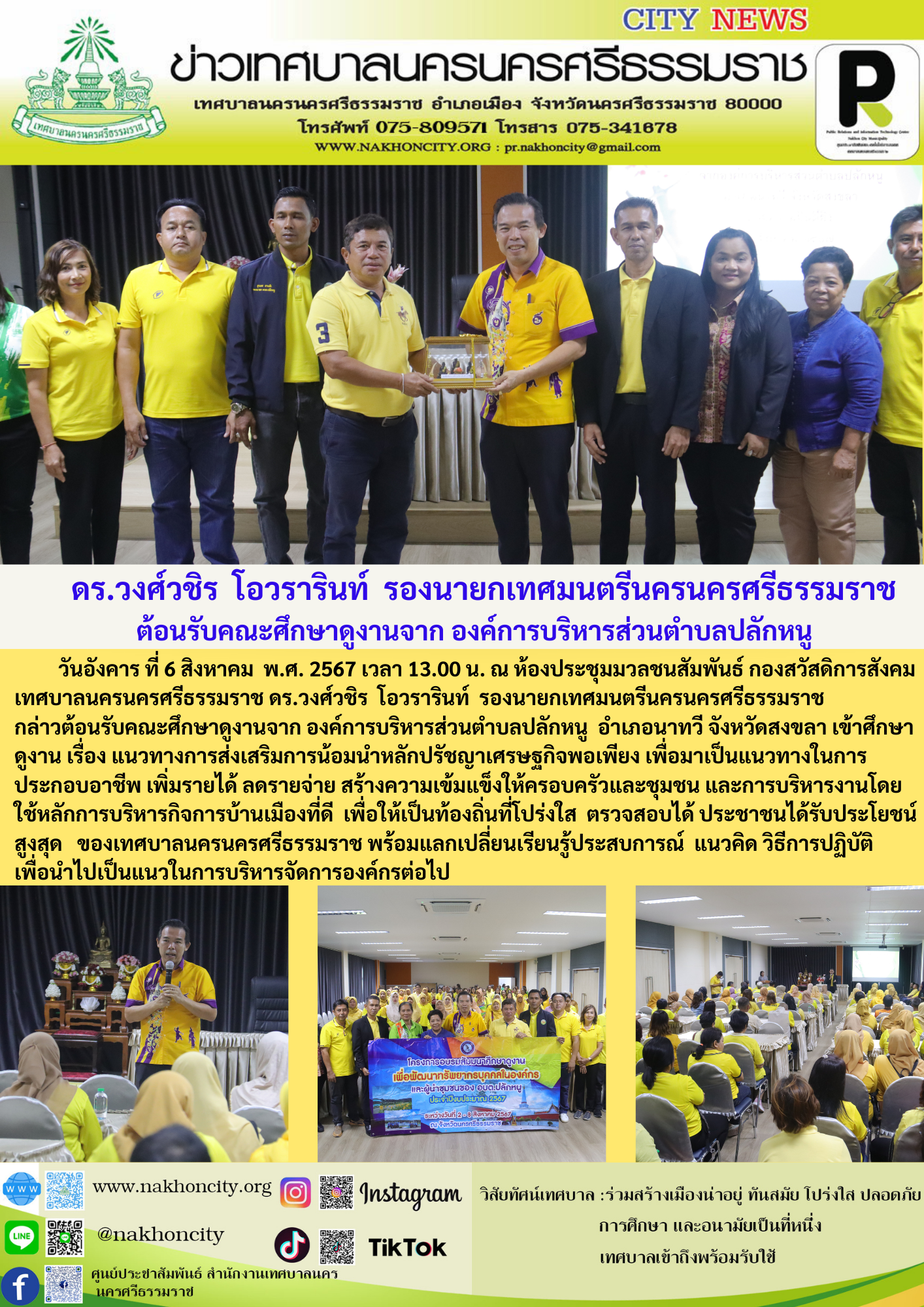 วันอังคาร ที่ 6 สิงหาคม พ.ศ. 2567 เวลา 13.00 น. ณ ห้องประชุมมวลชนสัมพันธ์ กองสวัสดิการสังคม เทศบาลนครนครศรีธรรมราช ดร.วงศ์วชิร โอวรารินท์ รองนายกเทศมนตรีนครนครศรีธรรมราช กล่าวต้อนรับคณะศึกษาดูงานจาก องค์การบริหารส่วนตำบลปลักหนู อำเภอนาทวี จังหวัดสงขลา เข้าศึกษาดูงาน เรื่อง แนวทางการส่งเสริมการน้อมนำหลักปรัชญาเศรษฐกิจพอเพียง เพื่อมาเป็นแนวทางในการประกอบอาชีพ เพิ่มรายได้ ลดรายจ่าย สร้างความเข้มแข็งให้ครอบครัวและชุมชน และการบริหารงานโดยใช้หลักการบริหารกิจการบ้านเมืองที่ดี เพื่อให้เป็นท้องถิ่นที่โปร่งใส ตรวจสอบได้ ประชาชนได้รับประโยชน์สูงสุด ของเทศบาลนครนครศรีธรรมราช พร้อมแลกเปลี่ยนเรียนรู้ประสบการณ์ แนวคิด วิธีการปฏิบัติ เพื่อนำไปเป็นแนวในการบริหารจัดการองค์กรต่อไป |