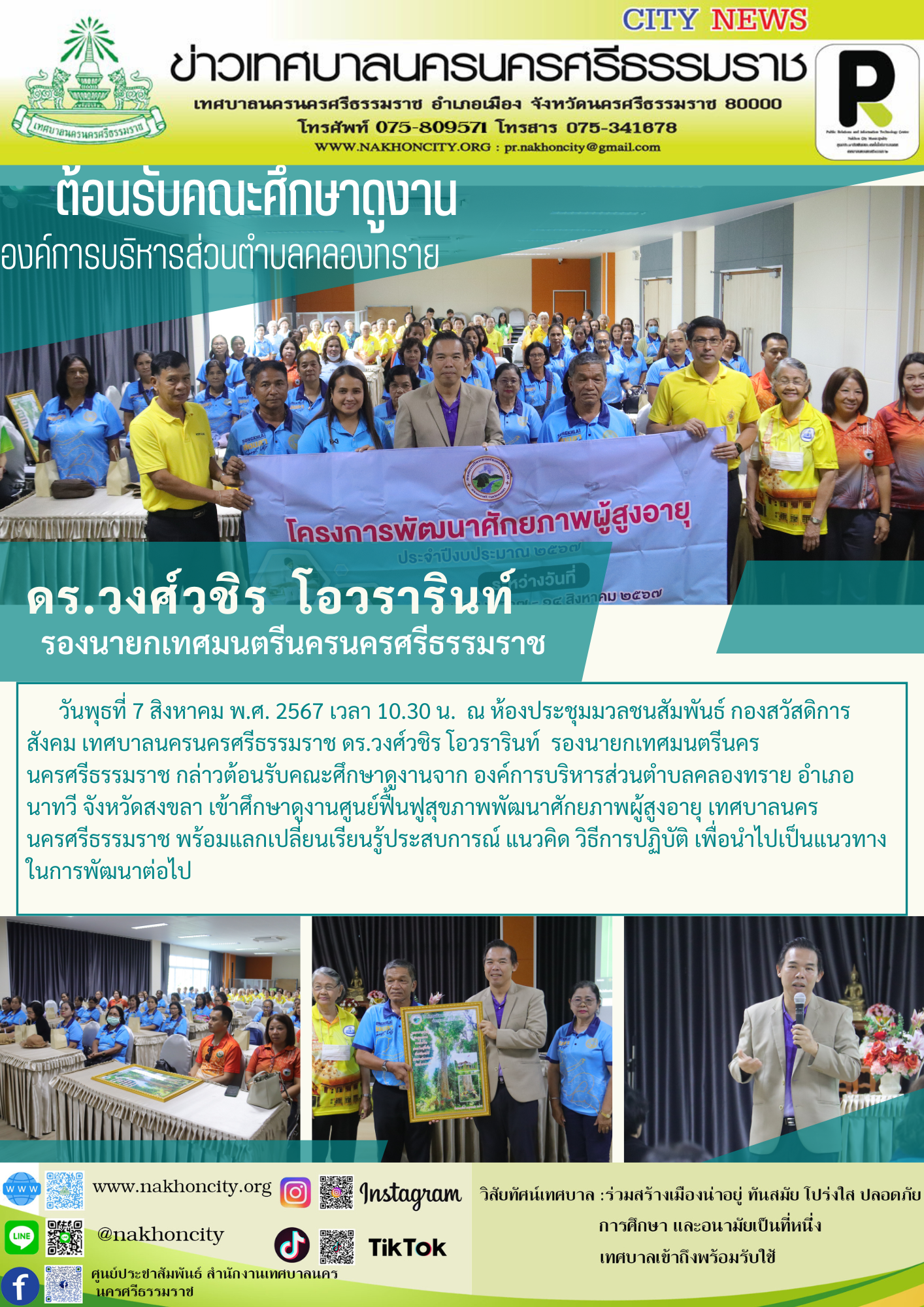วันพุธที่ 7 สิงหาคม พ.ศ. 2567 เวลา 10.30 น. ณ ห้องประชุมมวลชนสัมพันธ์ กองสวัสดิการสังคม เทศบาลนครนครศรีธรรมราช ดร.วงศ์วชิร โอวรารินท์ รองนายกเทศมนตรีนครนครศรีธรรมราช กล่าวต้อนรับคณะศึกษาดูงานจาก องค์การบริหารส่วนตำบลคลองทราย อำเภอนาทวี จังหวัดสงขลา เข้าศึกษาดูงานศูนย์ฟื้นฟูสุขภาพพัฒนาศักยภาพผู้สูงอายุ เทศบาลนครนครศรีธรรมราช พร้อมแลกเปลี่ยนเรียนรู้ประสบการณ์ แนวคิด วิธีการปฏิบัติ เพื่อนำไปเป็นแนวทางในการพัฒนาต่อไป