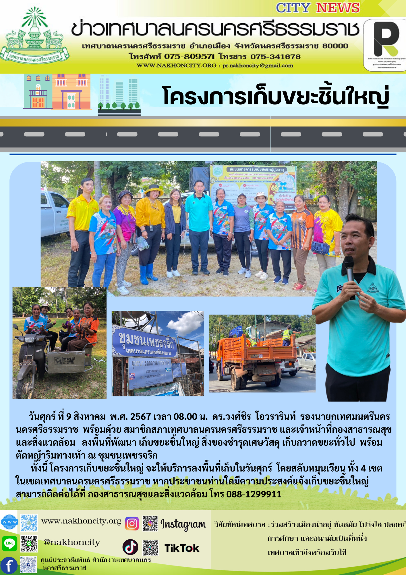 วันศุกร์ที่ 9 สิงหาคม พ.ศ. 2567 เวลา 08.00 น. ดร.วงศ์ชิร โอวรารินท์ รองนายกเทศมนตรีนครนครศรีธรรมราช พร้อมด้วย สมาชิกสภาเทศบาลนครนครศรีธรรมราช และเจ้าหน้าที่กองสาธารณสุขและสิ่งแวดล้อม ลงพื้นที่พัฒนา เก็บขยะชิ้นใหญ่ สิ่งของชำรุดเศษวัสดุ เก็บกวาดขยะทั่วไป พร้อมตัดหญ้าริมทางเท้า ณ ชุมชนเพชรจริก ทั้งนี้ โครงการเก็บขยะชิ้นใหญ่ จะให้บริการลงพื้นที่เก็บในวันศุกร์ โดยสลับหมุนเวียน ทั้ง 4 เขต ในเขตเทศบาลนครนครศรีธรรมราช หากประชาชนท่านใดมีความประสงค์แจ้งเก็บขยะชิ้นใหญ่ สามารถติดต่อได้ที่ กองสาธารณสุขและสิ่งแวดล้อม โทร 088-1299911 |