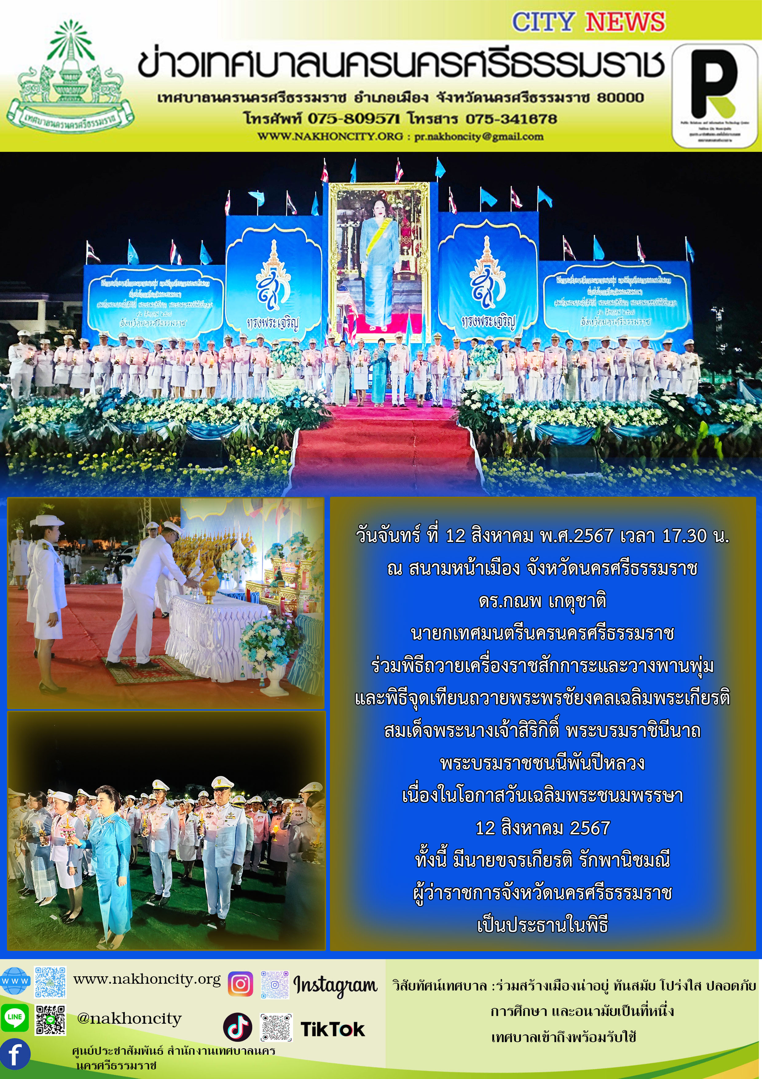 นายกเทศมนตรีนครนครศรีธรรมราช ร่วมพิธีถวายเครื่องราชสักการะและวางพานพุ่ม และพิธีจุดเทียนถวายพระพรชัยงคลเฉลิมพระเกียรติสมเด็จพระนางเจ้าสิริกิติ์ พระบรมราชินีนาถ พระบรมราชชนนีพันปีหลวง เนื่องในโอกาสวันเฉลิมพระชนมพรรษา 12 สิงหาคม 2567 |