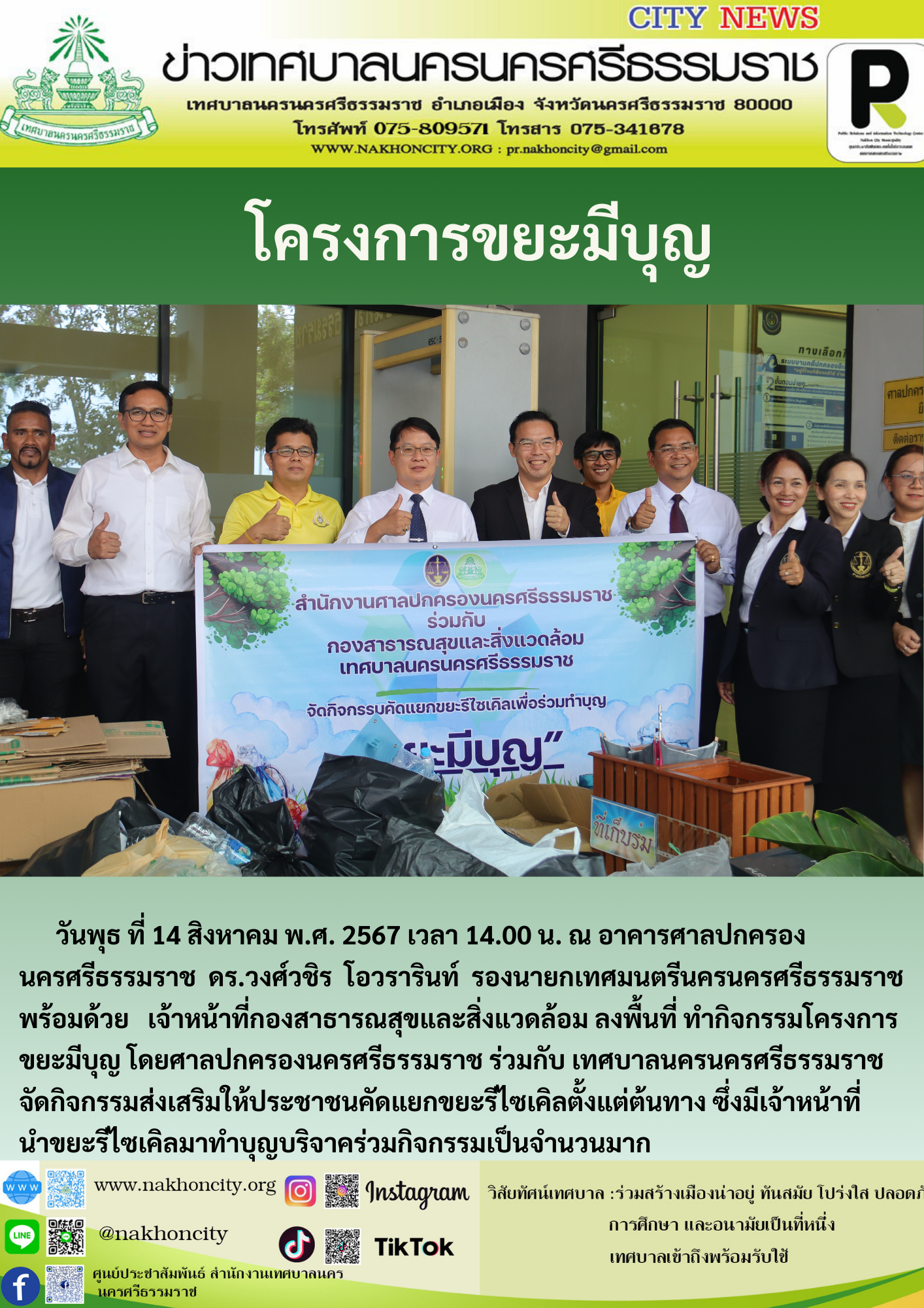 วันพุธ ที่ 14 สิงหาคม พ.ศ. 2567 เวลา 10.00 น. ดร.วงศ์วชิร โอวรารินท์ รองนายกเทศมนตรีนครนครศรีธรรมราช พร้อมด้วยเจ้าหน้าที่กองสาธารณสุขและสิ่งแวดล้อม ลงพื้นที่ ทำกิจกรรมโครงการขยะมีบุญ โดยศาลปกครองนครศรีธรรมราช ร่วมกับ เทศบาลนครนครศรีธรรมราช จัดกิจกรรมส่งเสริมให้ประชาชนคัดแยกขยะรีไซเคิลตั้งแต่ต้นทาง ซึ่งมีเจ้าหน้าที่ นำขยะรีไซเคิลมาทำบุญบริจาคร่วมกิจกรรมเป็นจำนวนมาก |
