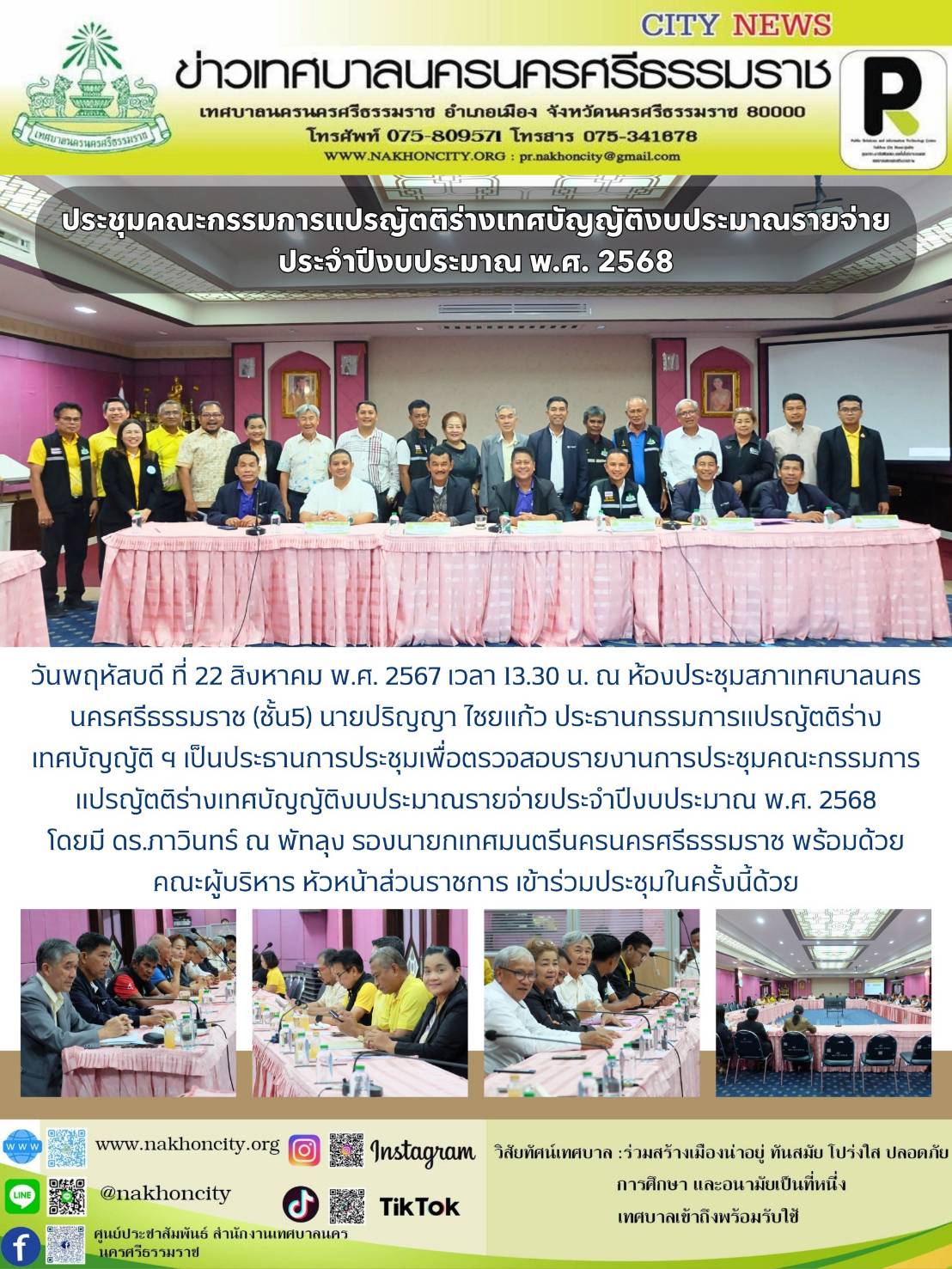 วันพฤหัสบดี ที่ 22 สิงหาคม พ.ศ. 2567 เวลา 13.30 น. ณ ห้องประชุมสภาเทศบาลนครนครศรีธรรมราช (ชั้น5) นายปริญญา ไชยแก้ว ประธานกรรมการแปรญัตติร่างเทศบัญญัติ ฯ เป็นประธานการประชุมเพื่อตรวจสอบรายงานการประชุมคณะกรรมการแปรญัตติร่างเทศบัญญัติงบประมาณรายจ่ายประจำปีงบประมาณ พ.ศ. 2568 โดยมี ดร.ภาวินทร์ ณ พัทลุง รองนายกเทศมนตรีนครนครศรีธรรมราช พร้อมด้วย คณะผู้บริหาร หัวหน้าส่วนราชการ เข้าร่วมประชุมในครั้งนี้ด้วย ................. ภาพ//ข่าว//จันทร์จิรา |