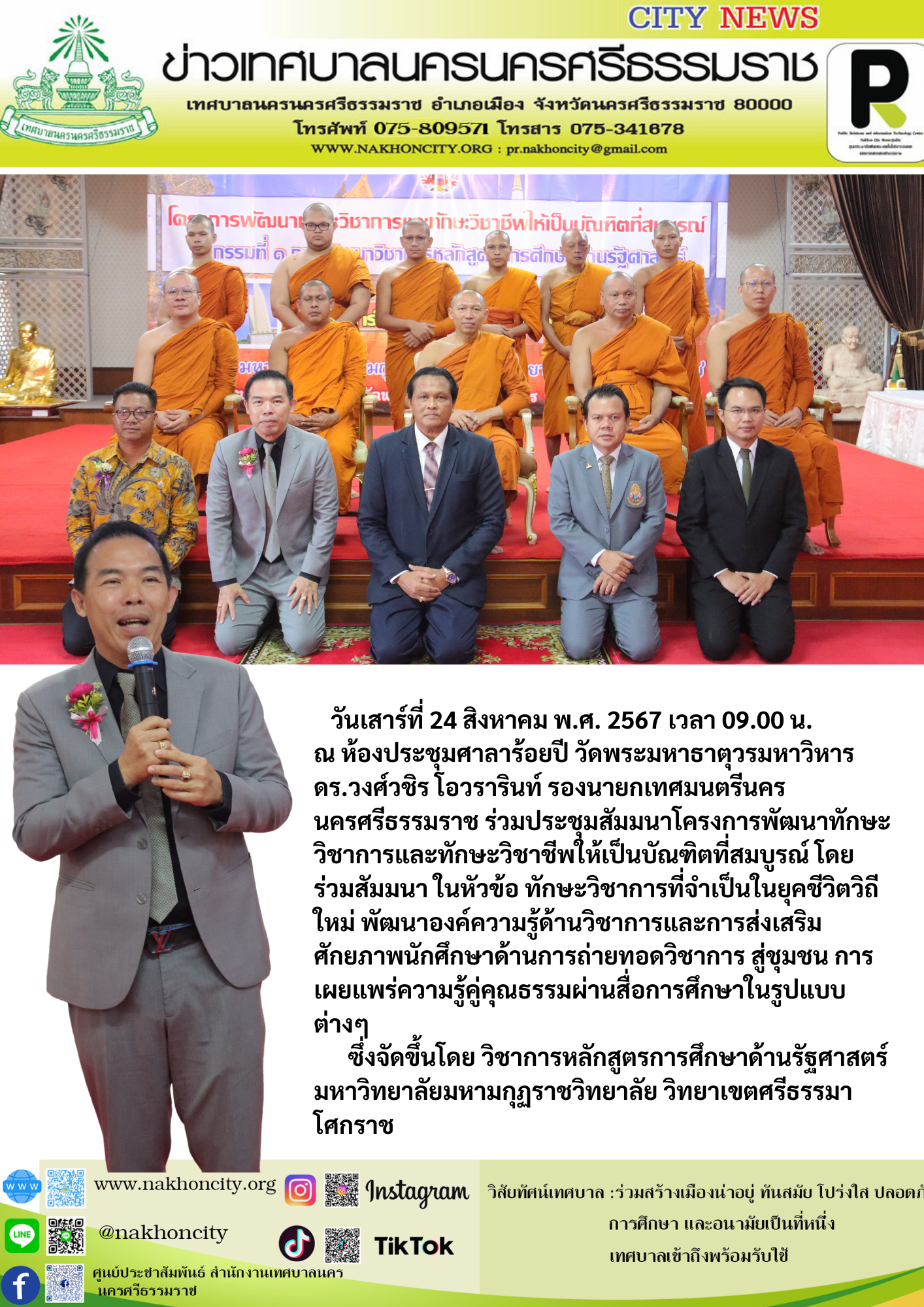 วันเสาร์ที่ 24 สิงหาคม พ.ศ. 2567 เวลา 09.00 น. ณ ห้องประชุมศาลาร้อยปี วัดพระมหาธาตุวรมหาวิหาร ดร.วงศ์วชิร โอวรารินท์ รองนายกเทศมนตรีนครนครศรีธรรมราช ร่วมประชุมสัมมนาโครงการพัฒนาทักษะวิชาการและทักษะวิชาชีพให้เป็นบัณฑิตที่สมบูรณ์ โดยร่วมสัมมนา ในหัวข้อ ทักษะวิชาการที่จำเป็นในยุคชีวิตวิถีใหม่ พัฒนาองค์ความรู้ด้านวิชาการและการส่งเสริมศักยภาพนักศึกษาด้านการถ่ายทอดวิชาการ สู่ชุมชน การเผยแพร่ความรู้คู่คุณธรรมผ่านสื่อการศึกษาในรูปแบบต่างๆ ซึ่งจัดขึ้นโดย วิชาการหลักสูตรการศึกษาด้านรัฐศาสตร์ มหาวิทยาลัยมหามกุฏราชวิทยาลัย วิทยาเขตศรีธรรมาโศกราช |