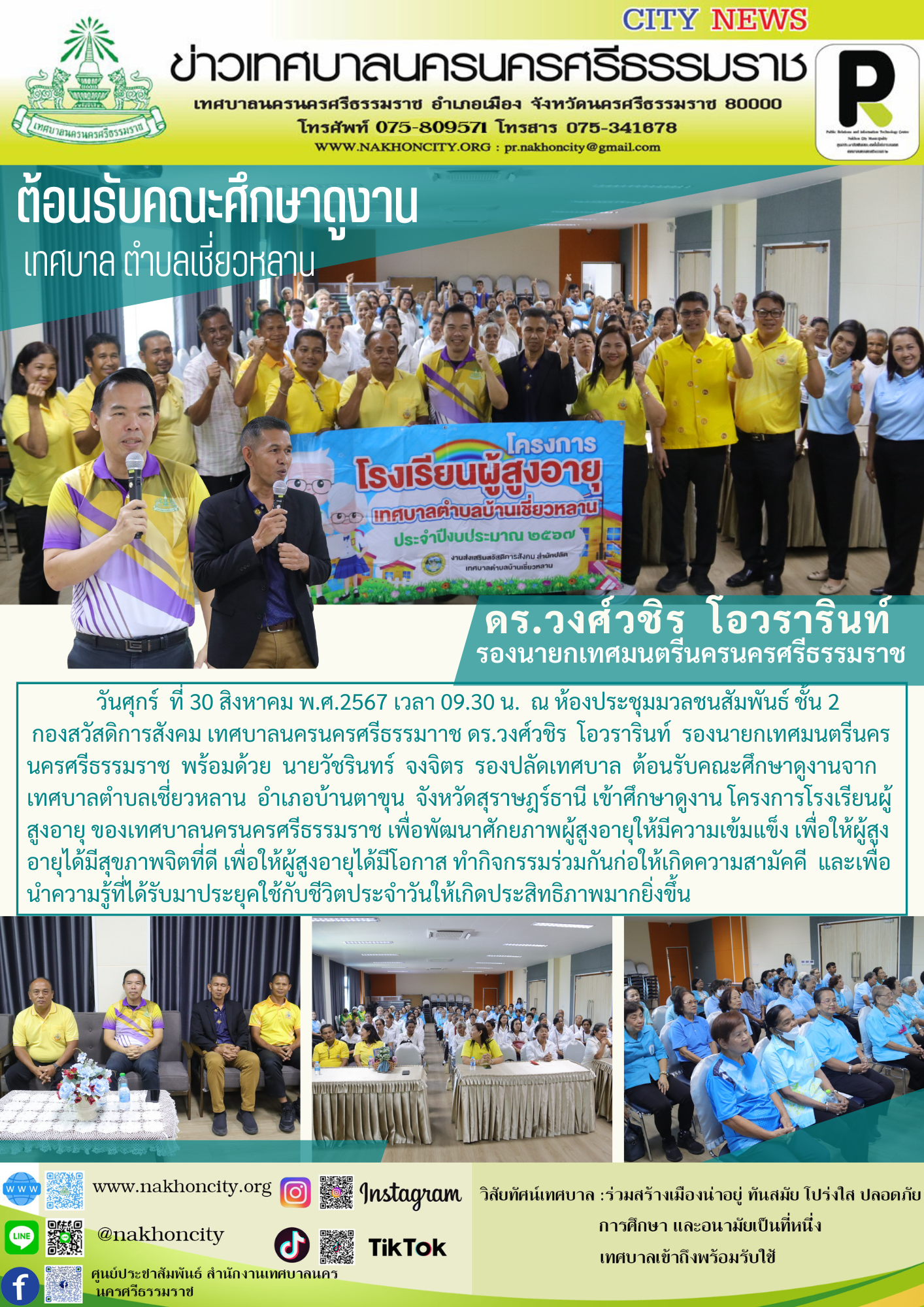 ดร.วงศ์วชิร โอวรารินท์ รองนายกเทศมนตรีนครนครศรีธรรมราช พร้อมด้วย นายวัชรินทร์ จงจิตร รองปลัดเทศบาล ต้อนรับคณะศึกษาดูงานจาก เทศบาลตำบลเชี่ยวหลาน อำเภอบ้านตาขุน จังหวัดสุราษฎร์ธานี |