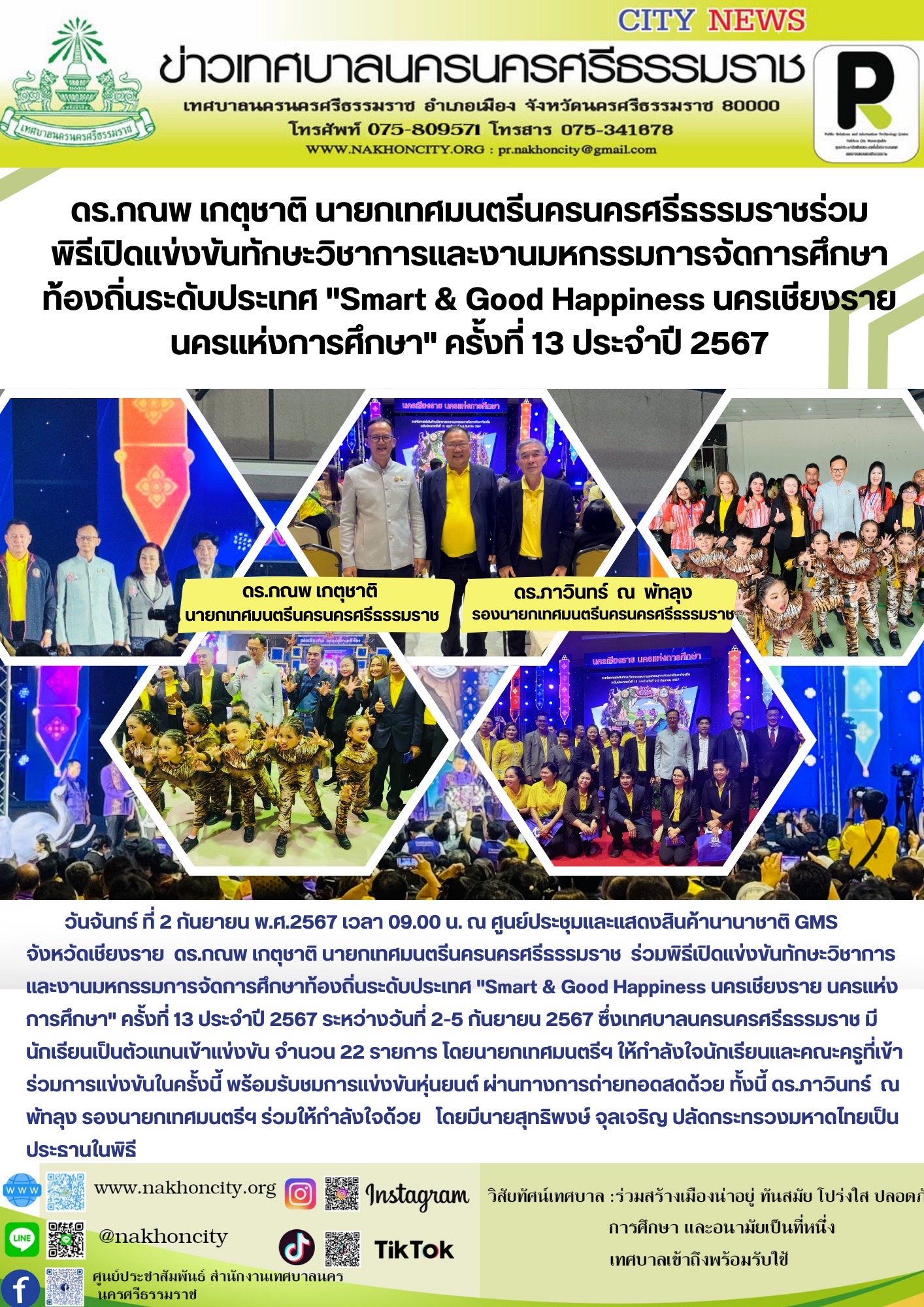 นายกเทศมนตรีนครนครศรีธรรมราชร่วมพิธีเปิดแข่งขันทักษะวิชาการและงานมหกรรมการจัดการศึกษาท้องถิ่นระดับประเทศ "Smart & Good Happiness นครเชียงราย นครแห่งการศึกษา" ครั้งที่ 13 ประจำปี 2567