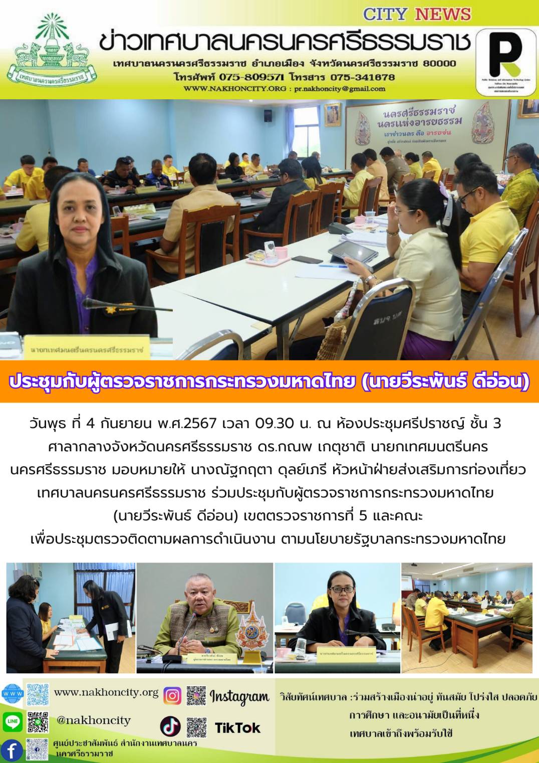 วันพุธ ที่ 4 กันยายน พ.ศ.2567 เวลา 09.30 น. ณ ห้องประชุมศรีปราชญ์ ชั้น 3 ศาลากลางจังหวัดนครศรีธรรมราช ดร.กณพ เกตุชาติ นายกเทศมนตรีนครนครศรีธรรมราช มอบหมายให้ นางณัฐกฤตา ดุลย์เภรี หัวหน้าฝ่ายส่งเสริมการท่องเที่ยว เทศบาลนครนครศรีธรรมราช ร่วมประชุมกับผู้ตรวจราชการกระทรวงมหาดไทย (นายวีระพันธ์ ดีอ่อน) เขตตรวจราชการที่ 5 และคณะ |