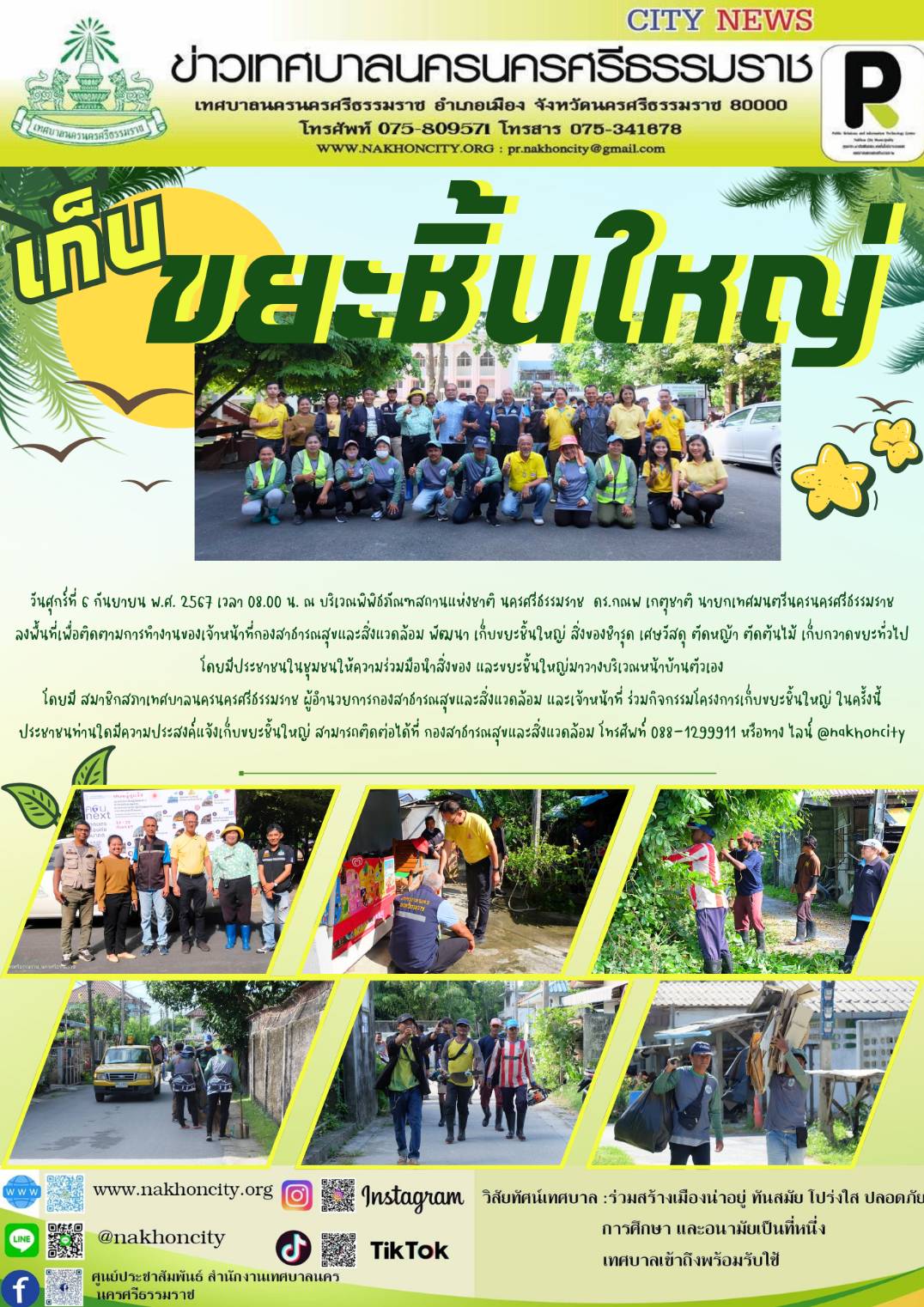 วันศุกร์ที่ 6 กันยายน พ.ศ. 2567 เวลา 08.00 น. ณ บริเวณพิพิธภัณฑสถานแห่งชาติ นครศรีธรรมราช ดร.กณพ เกตุชาติ นายกเทศมนตรีนครนครศรีธรรมราช ลงพื้นที่เพื่อติดตามการทำงานของเจ้าหน้าที่กองสาธารณสุขและสิ่งแวดล้อม พัฒนา เก็บขยะชิ้นใหญ่ สิ่งของชำรุด เศษวัสดุ ตัดหญ้า ตัดต้นไม้ เก็บกวาดขยะทั่วไป โดยมีประชาชนในชุมชนให้ความร่วมมือนำสิ่งของ และขยะชิ้นใหญ่มาวางบริเวณหน้าบ้านตัวเอง โดยมี สมาชิกสภาเทศบาลนครนครศรีธรรมราช ผู้อำนวยการกองสาธารณสุขและสิ่งแวดล้อม และเจ้าหน้าที่ ร่วมกิจกรรมโครงการเก็บขยะชิ้นใหญ่ ในครั้งนี้ ประชาชนท่านใดมีความประสงค์แจ้งเก็บขยะชิ้นใหญ่ สามารถติดต่อได้ที่ กองสาธารณสุขและสิ่งแวดล้อม โทรศัพท์ 088-1299911 หรือทาง ไลน์ @nakhoncity |