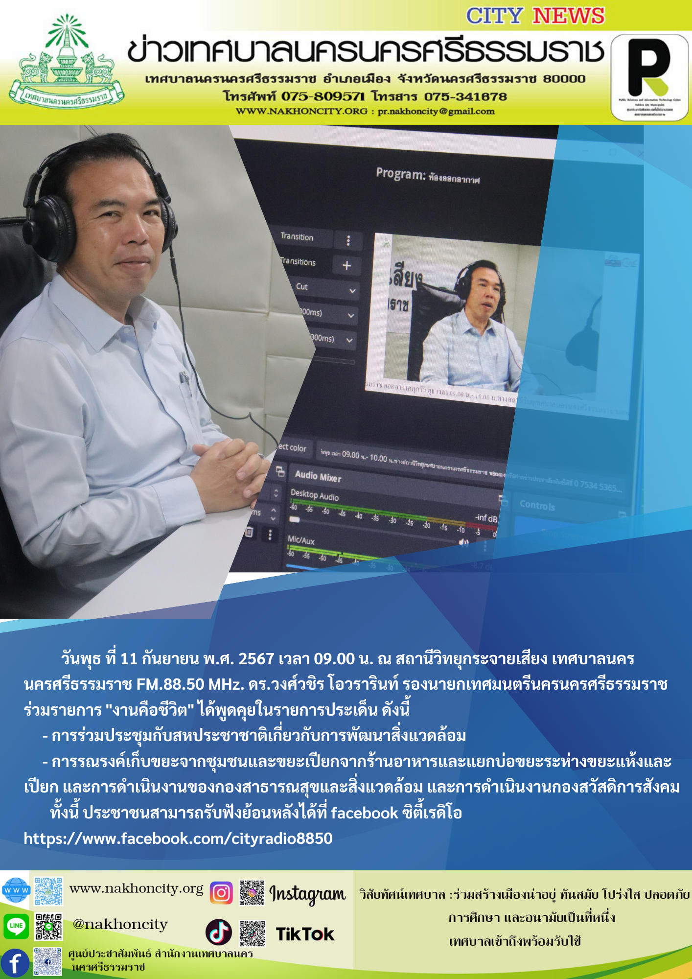 ดร.วงศ์วชิร โอวรารินท์ รองนายกเทศมนตรีนครนครศรีธรรมราช ร่วมรายการ "งานคือชีวิต" ทางสถานีวิทยุกระจายเสียง เทศบาลนครนครศรีธรรมราช FM.88.50 MHz. |