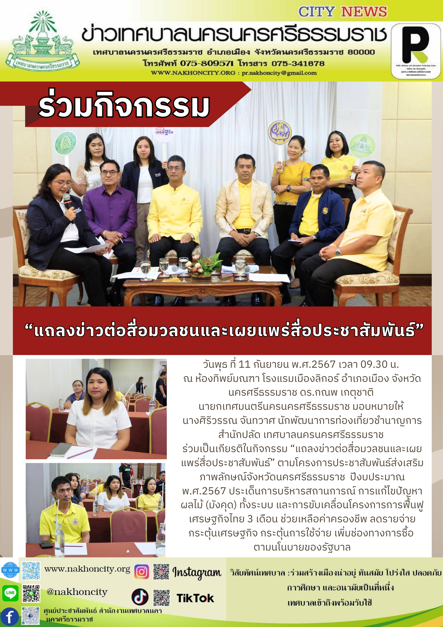 วันพุธ ที่ 11 กันยายน พ.ศ.2567 เวลา 09.30 น. ณ ห้องทิพย์มณฑา โรงแรมเมืองลิกอร์ อำเภอเมือง จังหวัดนครศรีธรรมราช ดร.กณพ เกตุชาติ นายกเทศมนตรีนครนครศรีธรรมราช มอบหมายให้ นางศิริวรรณ จันทวาศ นักพัฒนาการท่องเที่ยวชำนาญการ สำนักปลัด เทศบาลนครนครศรีธรรมราช ร่วมเป็นเกียรติในกิจกรรม “แถลงข่าวต่อสื่อมวลชนและเผยแพร่สื่อประชาสัมพันธ์” ตามโครงการประชาสัมพันธ์ส่งเสริมภาพลักษณ์จังหวัดนครศรีธรรมราช ปีงบประมาณ พ.ศ.2567 ประเด็นการบริหารสถานการณ์ การแก้ไขปัญหาผลไม้ (มังคุด) ทั้งระบบ และการขับเคลื่อนโครงการการฟื้นฟูเศรษฐกิจไทย 3 เดือน ช่วยเหลือค่าครองชีพ ลดรายจ่าย กระตุ้นเศรษฐกิจ กระตุ้นการใช้จ่าย เพิ่มช่องทางการซื้อ ตามนโนบายของรัฐบาล ................ ภาพ//ข่าว//จันทร์จิรา |