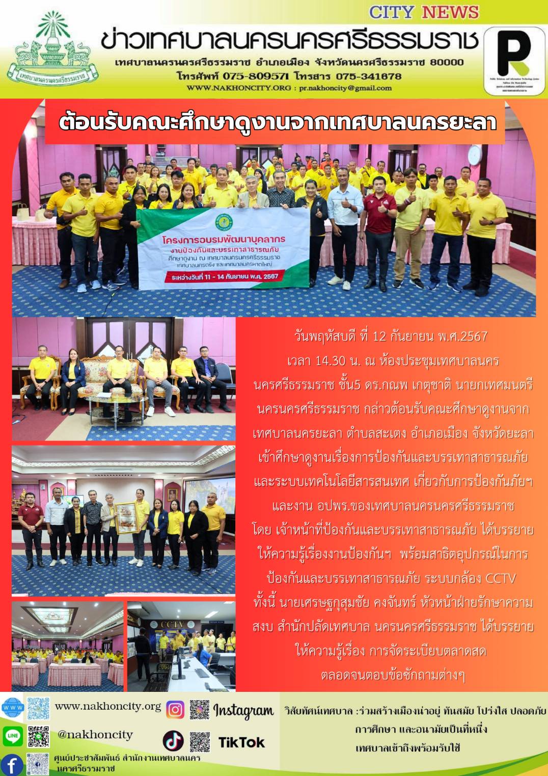 วันพฤหัสบดี ที่ 12 กันยายน พ.ศ.2567 เวลา 14.30 น. ณ ห้องประชุมเทศบาลนครนครศรีธรรมราช ชั้น5 ดร.กณพ เกตุชาติ นายกเทศมนตรีนครนครศรีธรรมราช กล่าวต้อนรับคณะศึกษาดูงานจากเทศบาลนครยะลา ตำบลสะเตง อำเภอเมือง จังหวัดยะลา เข้าศึกษาดูงานเรื่องการป้องกันและบรรเทาสาธารณภัย และระบบเทคโนโลยีสารสนเทศ เกี่ยวกับการป้องกันภัยฯ และงาน อปพร.ของเทศบาลนครนครศรีธรรมราช โดย เจ้าหน้าที่ป้องกันและบรรเทาสาธารณภัย ได้บรรยายให้ความรู้เรื่องงานป้องกันฯ พร้อมสาธิตอุปกรณ์ในการป้องกันและบรรเทาสาธารณภัย ระบบกล้อง CCTV ทั้งนี้ นายเศรษฐกุสุมชัย คงจันทร์ หัวหน้าฝ่ายรักษาความสงบ สำนักปลัดเทศบาล นครนครศรีธรรมราช ได้บรรยายให้ความรู้เรื่อง การจัดระเบียบตลาดสด ตลอดจนตอบข้อซักถามต่างๆ ............. ภาพ//ข่าว//จันทร์จิรา |