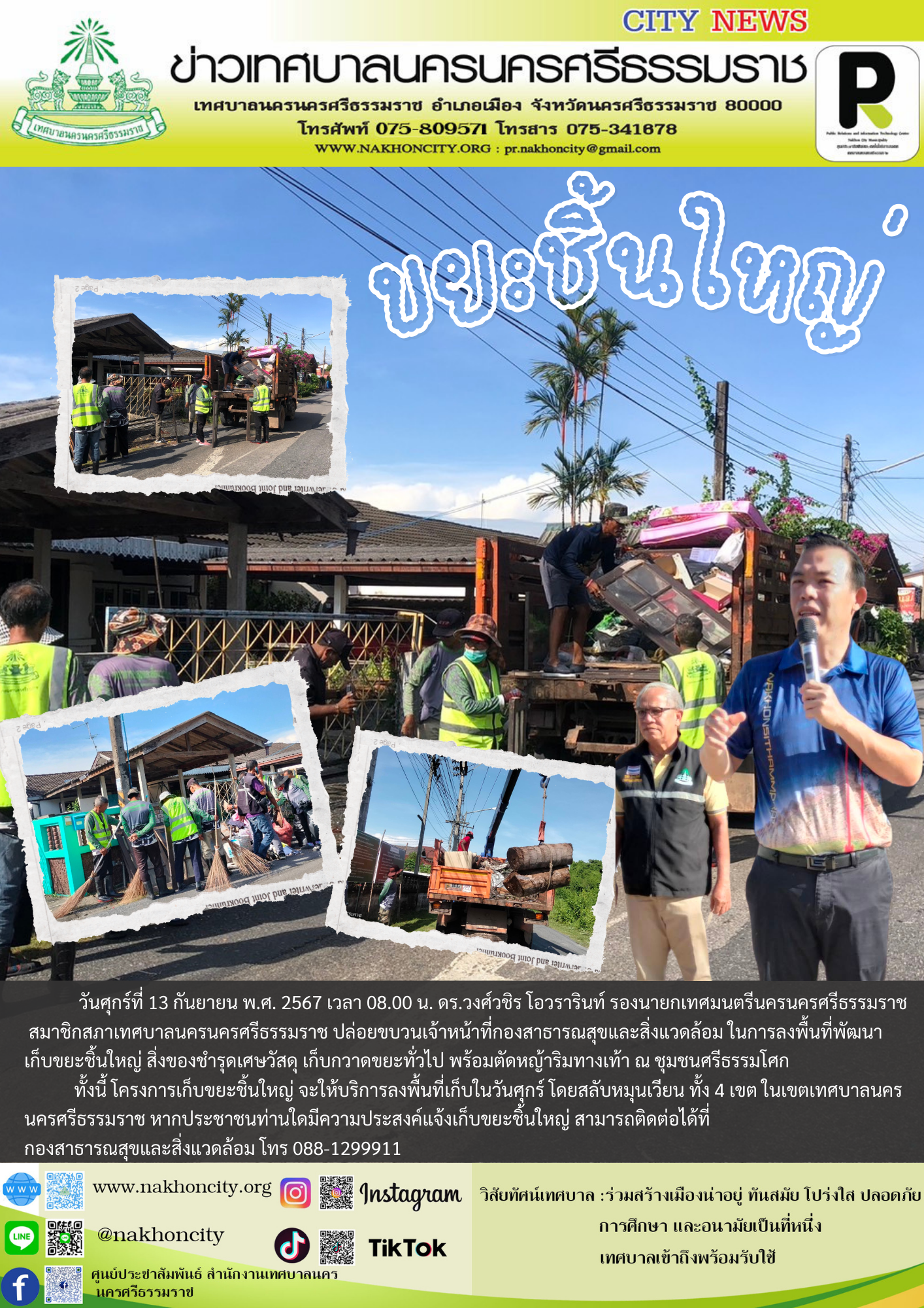 วันศุกร์ที่ 13 กันยายน พ.ศ. 2567 เวลา 08.00 น. ดร.วงศ์วชิร โอวรารินท์ รองนายกเทศมนตรีนครนครศรีธรรมราช สมาชิกสภาเทศบาลนครนครศรีธรรมราช ปล่อยขบวนเจ้าหน้าที่กองสาธารณสุขและสิ่งแวดล้อม ในการลงพื้นที่พัฒนา เก็บขยะชิ้นใหญ่ สิ่งของชำรุดเศษวัสดุ เก็บกวาดขยะทั่วไป พร้อมตัดหญ้าริมทางเท้า ณ ชุมชนศรีธรรมโศก |