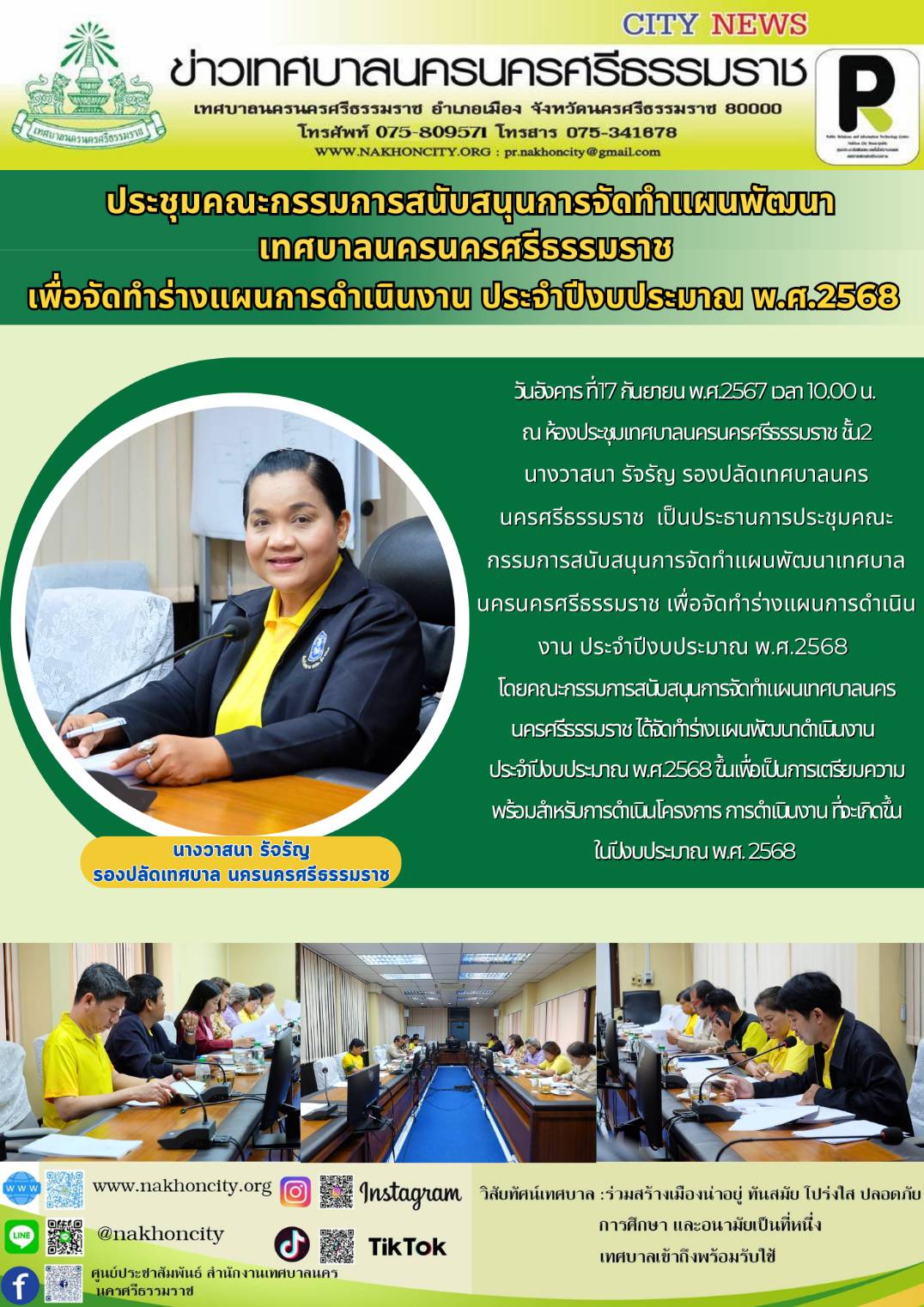 นางวาสนา รัจรัญ รองปลัดเทศบาลนครนครศรีธรรมราช เป็นประธานการประชุมคณะกรรมการสนับสนุนการจัดทำแผนพัฒนาเทศบาลนครนครศรีธรรมราช |