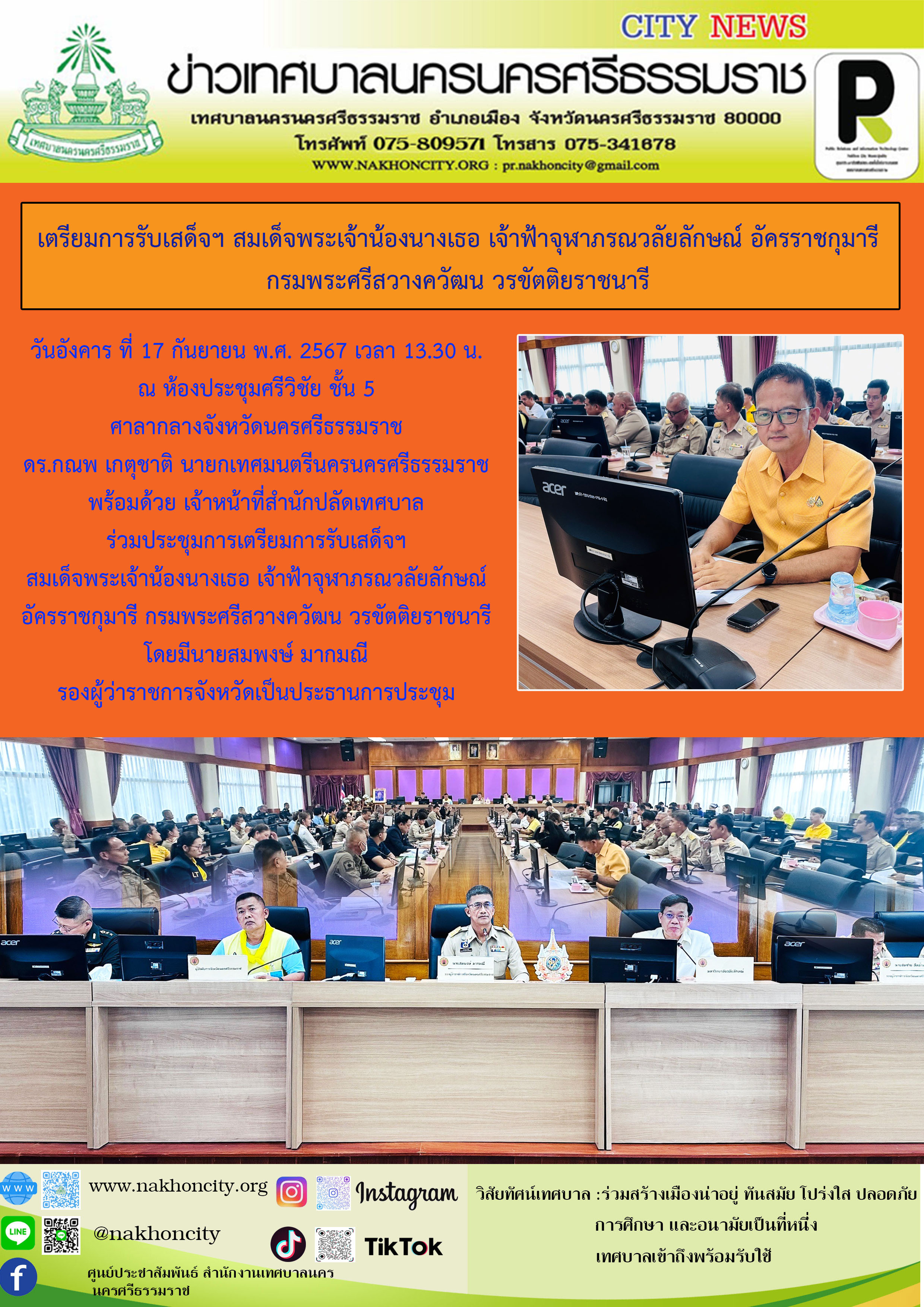 นายกเทศมนตรีนครนครศรีธรรมราช พร้อมด้วย เจ้าหน้าที่สำนักปลัดเทศบาล ร่วมประชุมการเตรียมการรับเสด็จฯ สมเด็จพระเจ้าน้องนางเธอ เจ้าฟ้าจุฬาภรณวลัยลักษณ์ อัครราชกุมารี กรมพระศรีสวางควัฒน วรขัตติยราชนารี |