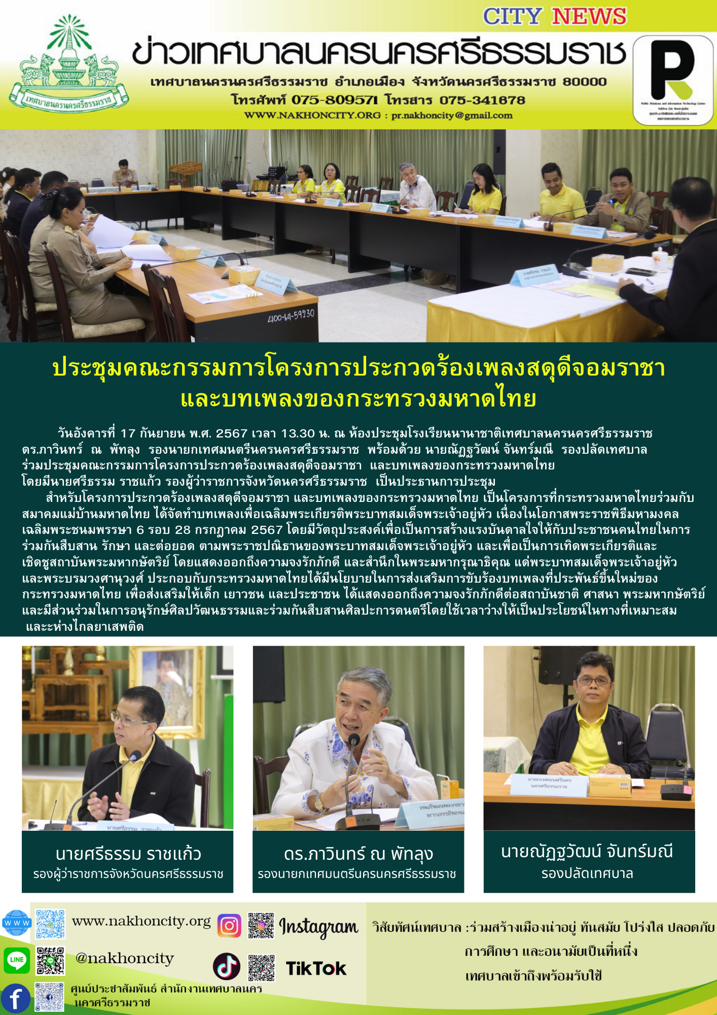 วันอังคารที่ 17 กันยายน พ.ศ. 2567 เวลา 13.30 น. ณ ห้องประชุมโรงเรียนนานาชาติเทศบาลนครนครศรีธรรมราช ดร.ภาวินทร์ ณ พัทลุง รองนายกเทศมนตรีนครนครศรีธรรมราช พร้อมด้วย นายณัฏฐวัฒน์ จันทร์มณี รองปลัดเทศบาล ร่วมประชุมคณะกรรมการโครงการประกวดร้องเพลงสดุดีจอมราชา และบทเพลงของกระทรวงมหาดไทย โดยมี นายศรีธรรม ราชแก้ว รองผู้ว่าราชการจังหวัดนครศรีธรรมราช เป็นประธานการประชุม สำหรับโครงการประกวดร้องเพลงสดุดีจอมราชา และบทเพลงของกระทรวงมหาดไทย เป็นโครงการที่กระทรวงมหาดไทยร่วมกับสมาคมแม่บ้านมหาดไทย ได้จัดทำบทเพลงเพื่อเฉลิมพระเกียรติพระบาทสมเด็จพระเจ้าอยู่หัว เนื่องในโอกาสพระราชพิธีมหามงคลเฉลิมพระชนมพรรษา 6 รอบ 28 กรกฎาคม 2567 โดยมีวัตถุประสงค์เพื่อเป็นการสร้างแรงบันดาลใจให้กับประชาชนคนไทยในการร่วมกันสืบสาน รักษา และต่อยอด ตามพระราชปณิธานของพระบาทสมเด็จพระเจ้าอยู่หัว และเพื่อเป็นการเทิดพระเกียรติและเชิดชูสถาบันพระมหากษัตริย์ โดยแสดงออกถึงความจงรักภักดี และสำนึกในพระมหากรุณาธิคุณ แด่พระบาทสมเด็จพระเจ้าอยู่หัว และพระบรมวงศานุวงศ์ ประกอบกับกระทรวงมหาดไทยได้มีนโยบายในการส่งเสริมการขับร้องบทเพลงที่ประพันธ์ขึ้นใหม่ของกระทรวงมหาดไทย เพื่อส่งเสริมให้เด็ก เยาวชน และประชาชน ได้แสดงออกถึงความจงรักภักดีต่อสถาบันชาติ ศาสนา พระมหากษัตริย์ และมีส่วนร่วมในการอนุรักษ์ศิลปวัฒนธรรมและร่วมกันสืบสานศิลปะการดนตรีโดยใช้เวลาว่างให้เป็นประโยชน์ในทางที่เหมาะสม และะห่างไกลยาเสพติด |