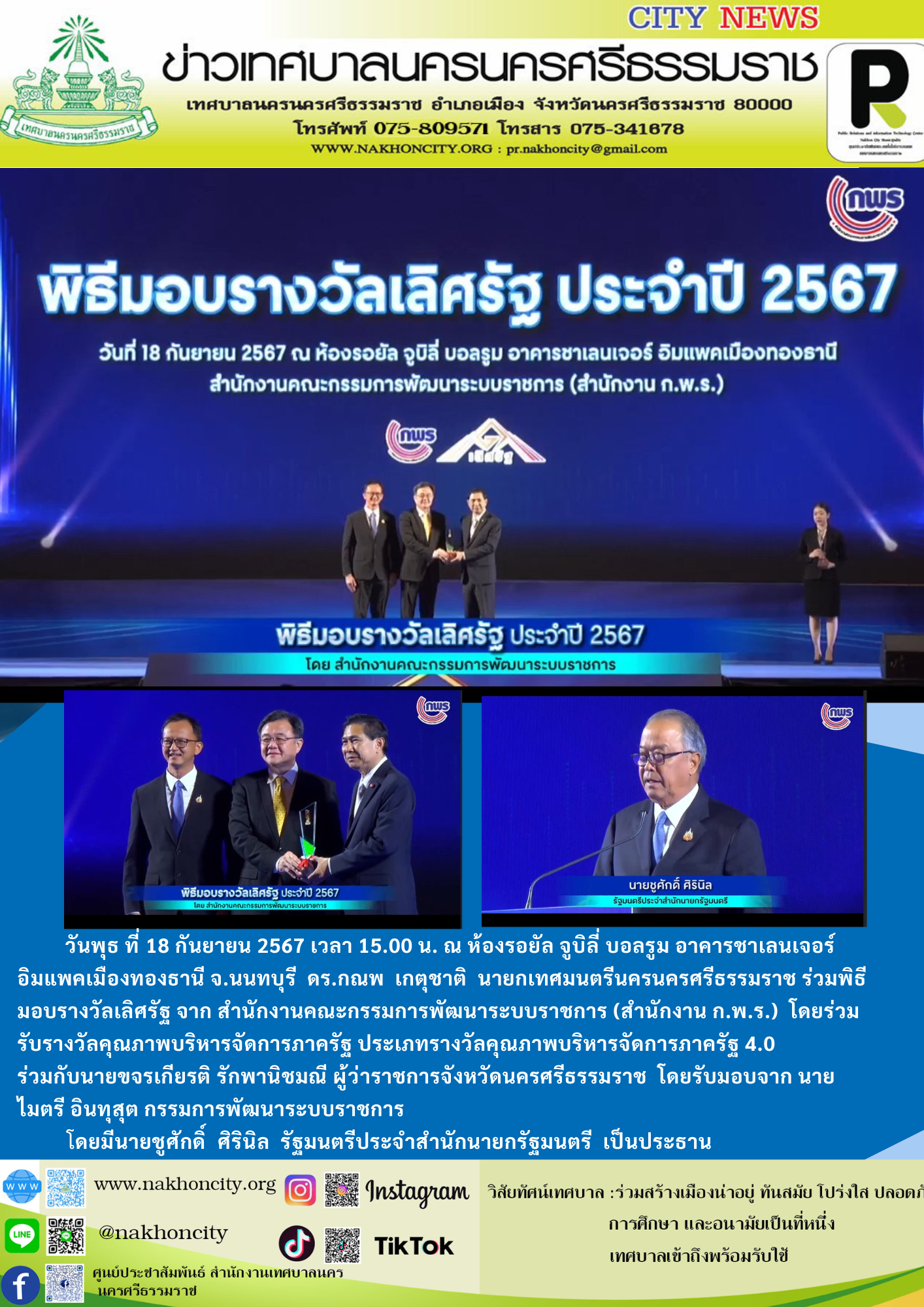 วันพุธ ที่ 18 กันยายน 2567 เวลา 15.00 น. ณ ห้องรอยัล จูบิลี่ บอลรูม อาคารชาเลนเจอร์ อิมแพคเมืองทองธานี จ.นนทบุรี ดร.กณพ เกตุชาติ นายกเทศมนตรีนครนครศรีธรรมราช ร่วมพิธีมอบรางวัลเลิศรัฐ จาก สำนักงานคณะกรรมการพัฒนาระบบราชการ (สำนักงาน ก.พ.ร.) โดยร่วมรับรางวัลคุณภาพบริหารจัดการภาครัฐ ประเภทรางวัลคุณภาพบริหารจัดการภาครัฐ 4.0 ร่วมกับนายขจรเกียรติ รักพานิชมณี ผู้ว่าราชการจังหวัดนครศรีธรรมราช โดยรับมอบจาก นายไมตรี อินทุสุต กรรมการพัฒนาระบบราชการ |