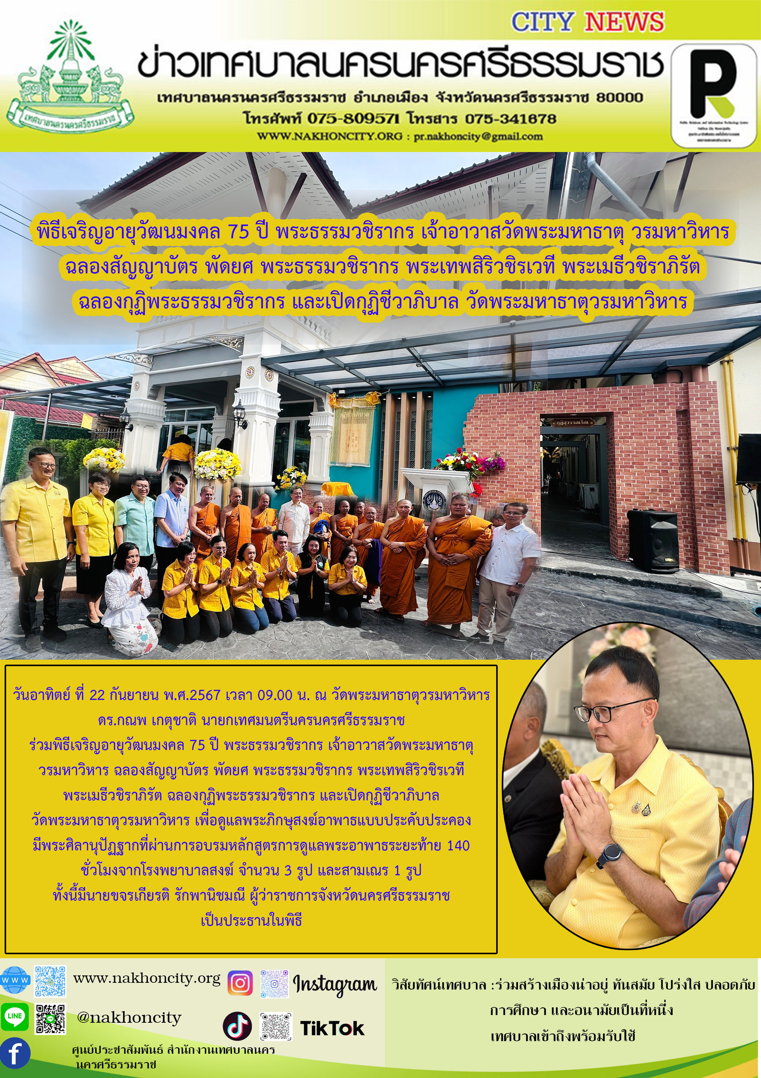 นายกเทศมนตรีนครนครศรีธรรมราช ร่วมพิธีเจริญอายุวัฒนมงคล 75 ปี พระธรรมวชิรากร เจ้าอาวาสวัดพระมหาธาตุ วรมหาวิหาร ฉลองสัญญาบัตร พัดยศ พระธรรมวชิรากร พระเทพสิริวชิรเวที พระเมธีวชิราภิรัต ฉลองกุฏิพระธรรมวชิรากร และเปิดกุฏิชีวาภิบาล วัดพระมหาธาตุวรมหาวิหาร |
