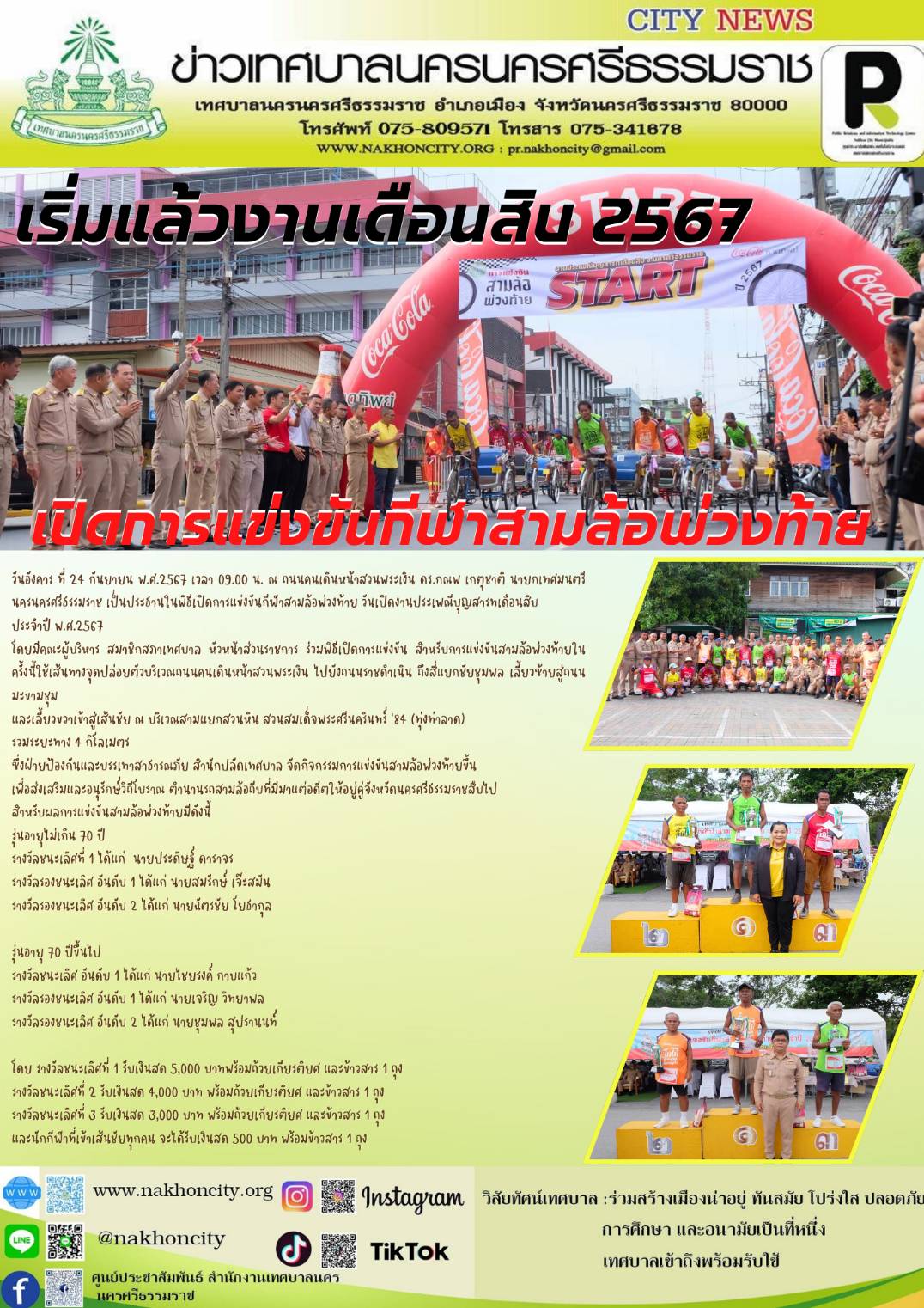 วันอังคาร ที่ 24 กันยายน พ.ศ.2567 เวลา 09.00 น. ณ ถนนคนเดินหน้าสวนพระเงิน ดร.กณพ เกตุชาติ นายกเทศมนตรีนครนครศรีธรรมราช เป็นประธานในพิธีเปิดการแข่งขันกีฬาสามล้อพ่วงท้าย วันเปิดงานประเพณีบุญสารทเดือนสิบ ประจำปี พ.ศ.2567 โดยมีคณะผู้บริหาร สมาชิกสภาเทศบาล หัวหน้าส่วนราชการ ร่วมพิธีเปิดการแข่งขัน สำหรับการแข่งขันสามล้อพ่วงท้ายในครั้งนี้ใช้เส้นทางจุดปล่อยตัวบริเวณถนนคนเดินหน้าสวนพระเงิน ไปยังถนนราชดำเนิน ถึงสี่แยกชัยชุมพล เลี้ยวซ้ายสู่ถนนมะขามชุม และเลี้ยวขวาเข้าสู่เส้นชัย ณ บริเวณสามแยกสวนหิน สวนสมเด็จพระศรีนครินทร์ ‘84 (ทุ่งท่าลาด) รวมระยะทาง 4 กิโลเมตร ซึ่งฝ่ายป้องกันและบรรเทาสาธารณภัย สำนักปลัดเทศบาล จัดกิจกรรมการแข่งขันสามล้อพ่วงท้ายขึ้น เพื่อส่งเสริมและอนุรักษ์วิถีโบราณ ตำนานรถสามล้อถีบที่มีมาแต่อดีตให้อยู่คู่จังหวัดนครศรีธรรมราชสืบไป สำหรับผลการแข่งขันสามล้อพ่วงท้ายมีดังนี้