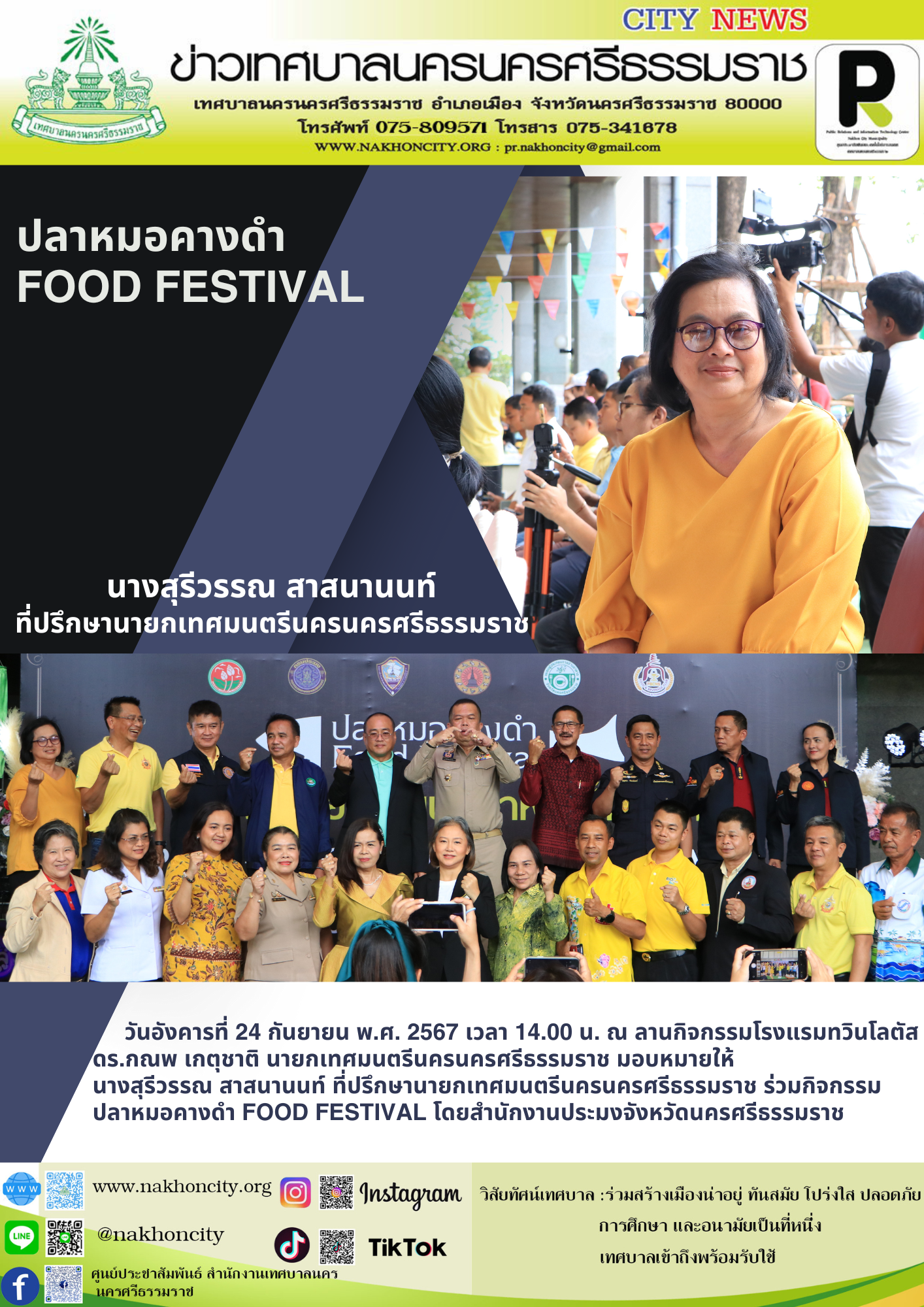 มอบหมายให้ นางสุรีวรรณ สาสนานนท์ ที่ปรึกษานายกเทศมนตรีนครนครศรีธรรมราช ร่วมกิจกรรม ปลาหมอคางดำ FOOD FESTIVAL โดยสำนักงานประมงจังหวัดนครศรีธรรมราช |