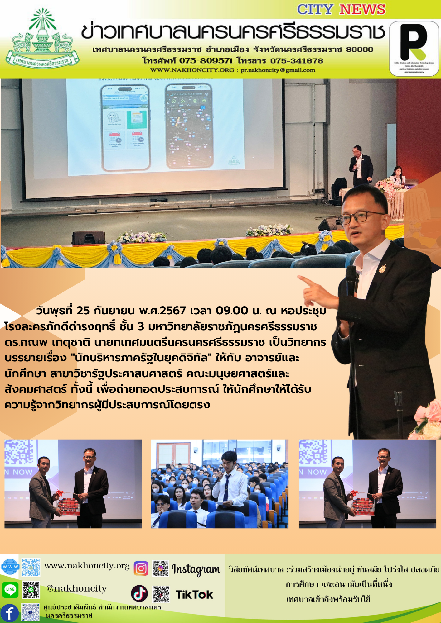 นายกเทศมนตรีนครนครศรีธรรมราช เป็นวิทยากรบรรยายเรื่อง "นักบริหารภาครัฐในยุคดิจิทัล" ให้กับ อาจารย์และ นักศึกษา สาขาวิชารัฐประศาสนศาสตร์ คณะมนุษยศาสตร์และสังคมศาสตร์ |