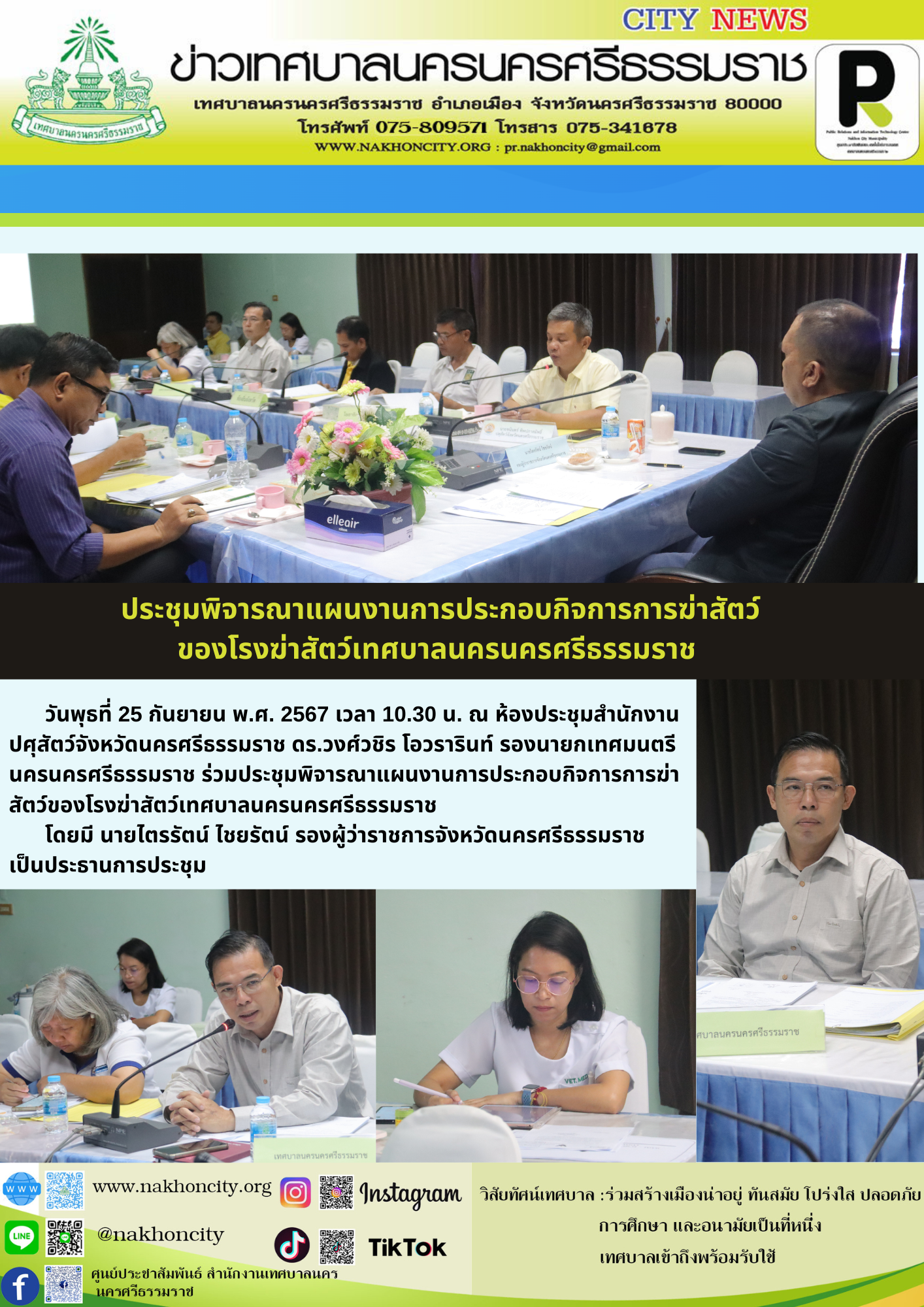 วันพุธที่ 25 กันยายน พ.ศ. 2567 เวลา 10.30 น. ณ ห้องประชุมสำนักงานปศุสัตว์จังหวัดนครศรีธรรมราช ดร.วงศ์วชิร โอวรารินท์ รองนายกเทศมนตรีนครนครศรีธรรมราช ร่วมประชุมพิจารณาแผนงานการประกอบกิจการการฆ่าสัตว์ของโรงฆ่าสัตว์เทศบาลนครนครศรีธรรมราช โดยมี นายไตรรัตน์ ไชยรัตน์ รองผู้ว่าราชการจังหวัดนครศรีธรรมราช เป็นประธานการประชุม |