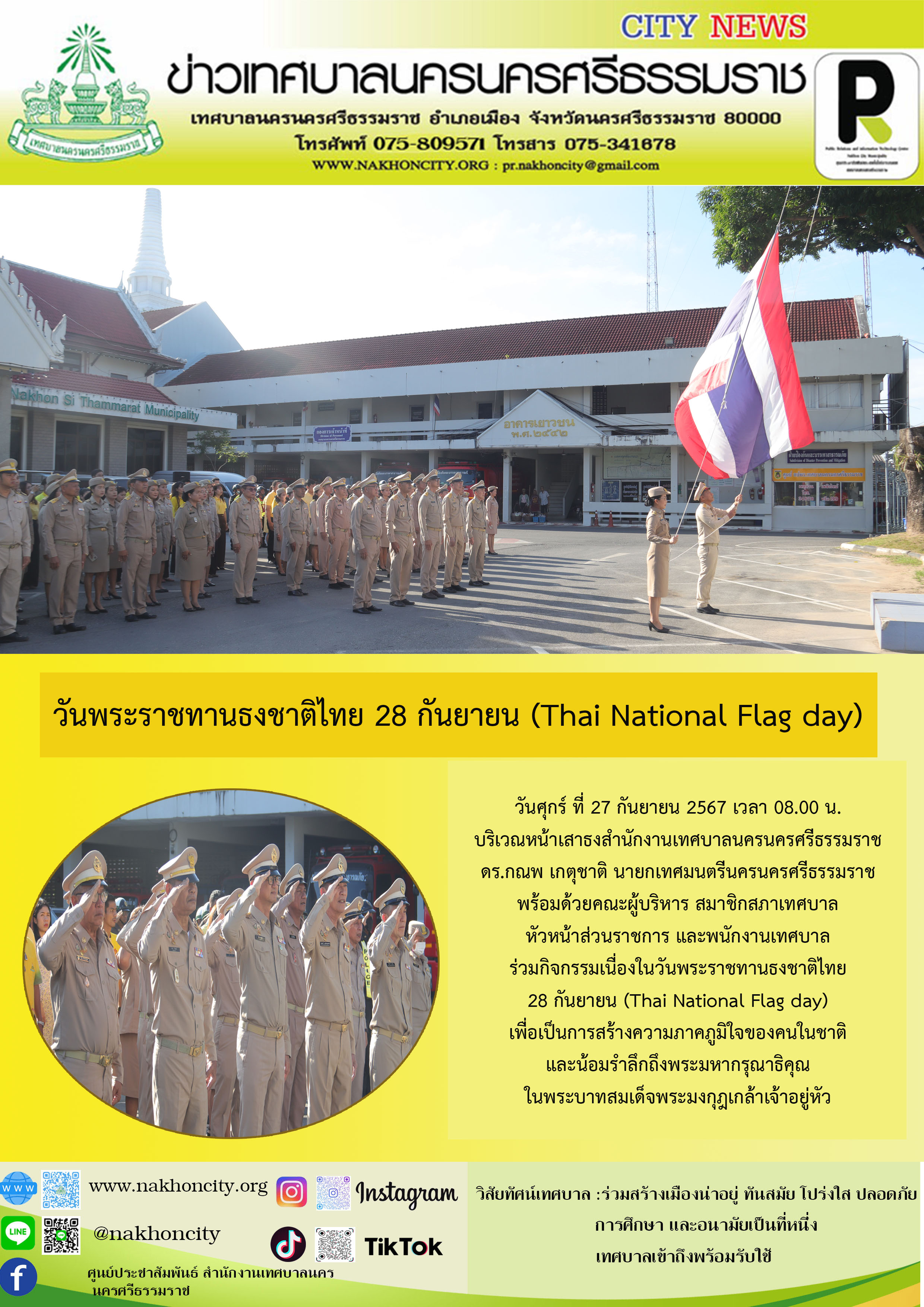 นายกเทศมนตรีนครนครศรีธรรมราช พร้อมด้วยคณะผู้บริหาร สมาชิกสภาเทศบาล หัวหน้าส่วนราชการ และพนักงานเทศบาล ร่วมกิจกรรมเนื่องในวันพระราชทานธงชาติไทย 28 กันยายน (Thai National Flag day) |