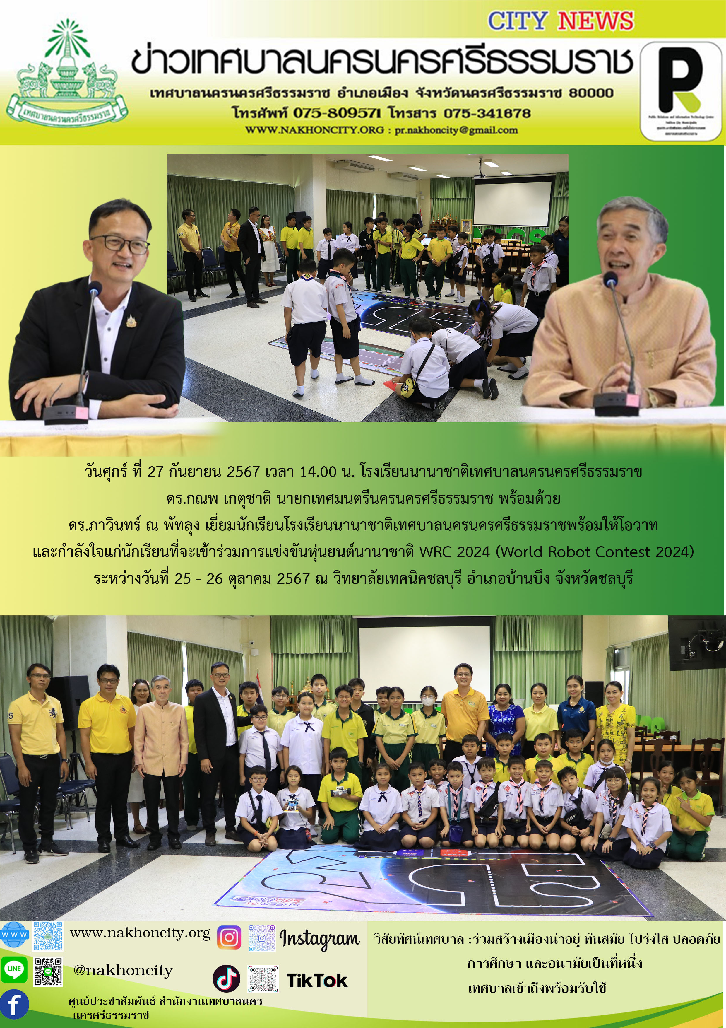 นายกเทศมนตรีนครนครศรีธรรมราช พบปะนักเรียนโรงเรียนนานาชาติเทศบาลนครนครศรีธรรมราชพร้อมให้โอวาท และกำลังใจแก่นักเรียนที่จะไปแข่งขันหุ่นยนต์ที่จังหวัดชลบุรี |