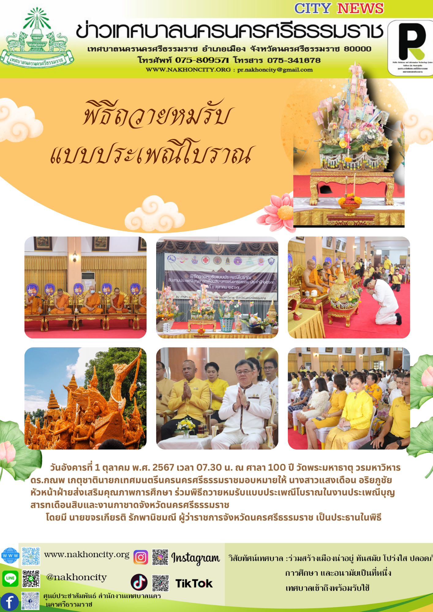 วันอังคารที่ 1 ตุลาคม พ.ศ. 2567 เวลา 07.30 น. ณ ศาลา 100 ปี วัดพระมหาธาตุ วรมหาวิหาร ดร.กณพ เกตุชาติ นายกเทศมนตรีนคนครศรีธรรมราช มอบหมายให้ นางสาวแสงเดือน อริยภูชัย หัวหน้าฝ่ายส่งเสริมคุณภาพการศึกษา ร่วมพิธีถวายหมรับแบบประเพณีโบราณ ในงานประเพณีบุญสารทเดือนสิบและงานกาชาดจังหวัดนครศรีธรรมราช โดยมี นายขจรเกียรติ รักพานิชมณี ผู้ว่าราชการจังหวัดนครศรีธรรมราช เป็นประธานในพิธี |