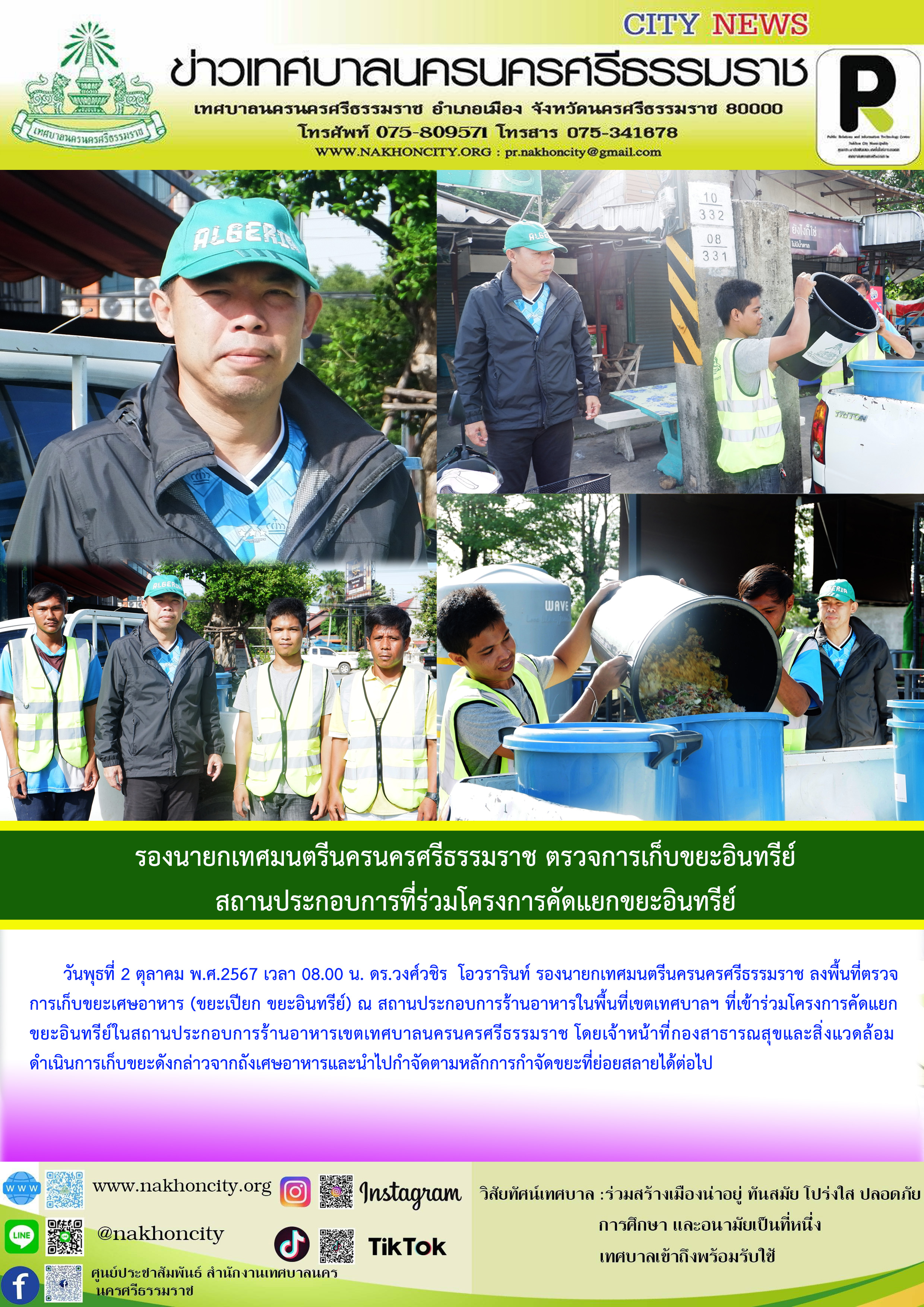 วันพุธที่ 2 ตุลาคม พ.ศ. 2567 เวลา 08.00 น. ดร.วงศ์วชิร โอวรารินท์ รองนายกเทศมนตรีนครนครศรีธรรมราช ลงพื้นที่ตรวจการเก็บขยะเศษอาหาร (ขยะเปียก ขยะอินทรีย์) ณ สถานประกอบการร้านอาหารในพื้นที่เขตเทศบาลฯ ที่เข้าร่วมโครงการคัดแยกขยะอินทรีย์ในสถานประกอบการร้านอาหารเขตเทศบาลนครนครศรีธรรมราช โดยเจ้าหน้าที่กองสาธารณสุขและสิ่งแวดล้อม ดำเนินการเก็บขยะดังกล่าวจากถังเศษอาหารและนำไปกำจัดตามหลักการกำจัดขยะที่ย่อยสลายได้ต่อไป |