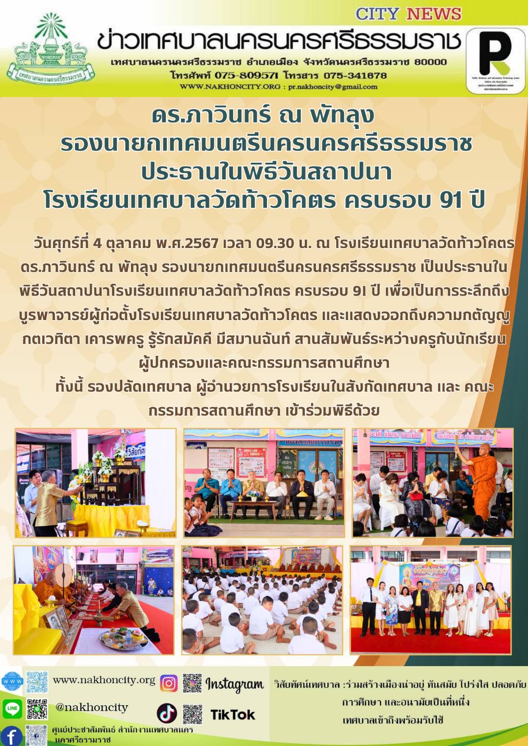 ดร.ภาวินทร์ ณ พัทลุง รองนายกเทศมนตรีนครนครศรีธรรมราช เป็นประธานในพิธีวันสถาปนาโรงเรียนเทศบาลวัดท้าวโคตร ครบรอบ 91 ปี |