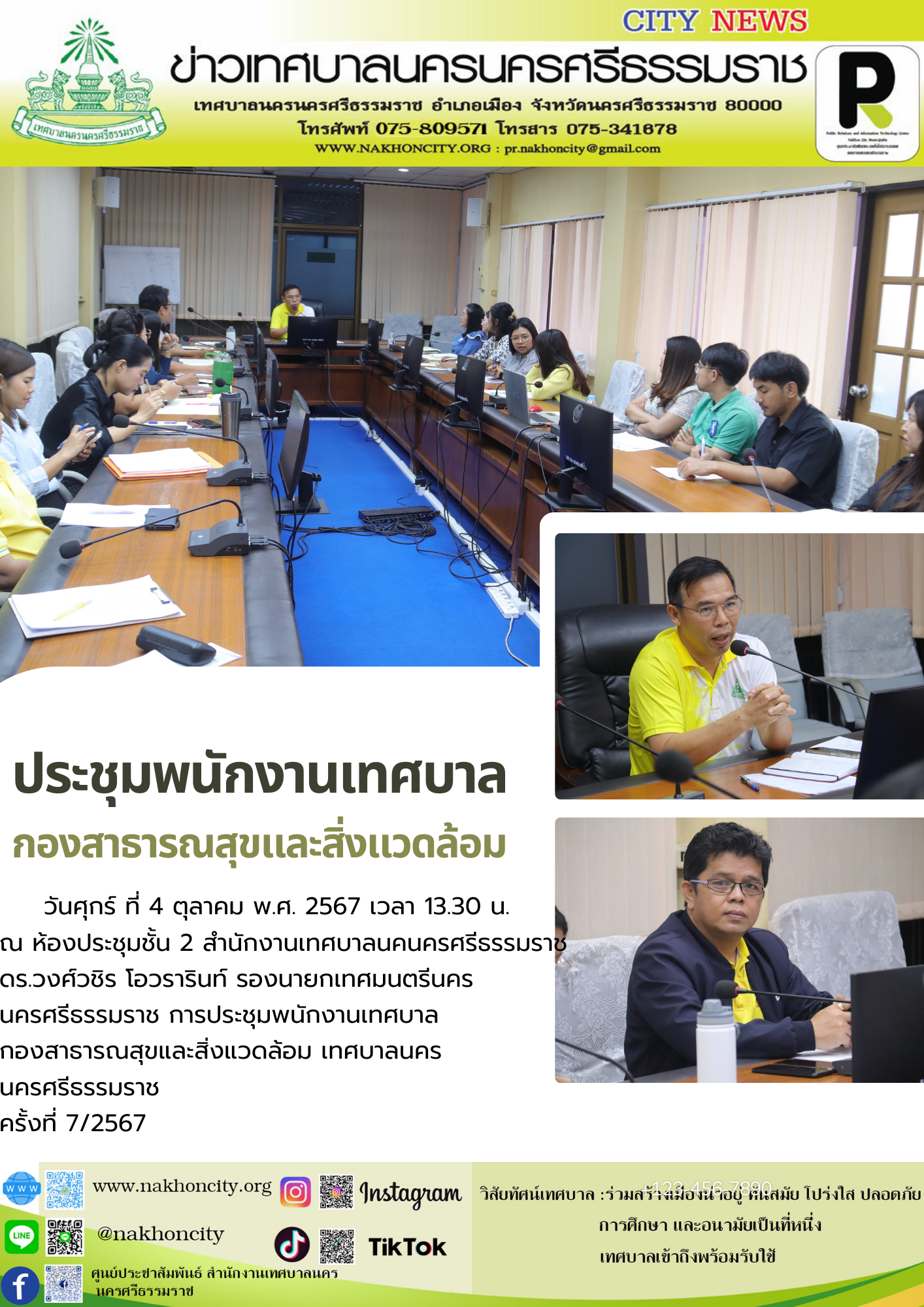 วันศุกร์ ที่ 4 ตุลาคม พ.ศ. 2567 เวลา 13.30 น. ณ ห้องประชุมชั้น 2 สำนักงานเทศบาลนคนครศรีธรรมราช ดร.วงศ์วชิร โอวรารินท์ รองนายกเทศมนตรีนครนครศรีธรรมราช การประชุมพนักงานเทศบาล กองสาธารณสุขและสิ่งแวดล้อม เทศบาลนครนครศรีธรรมราช ครั้งที่ 7/2567 |