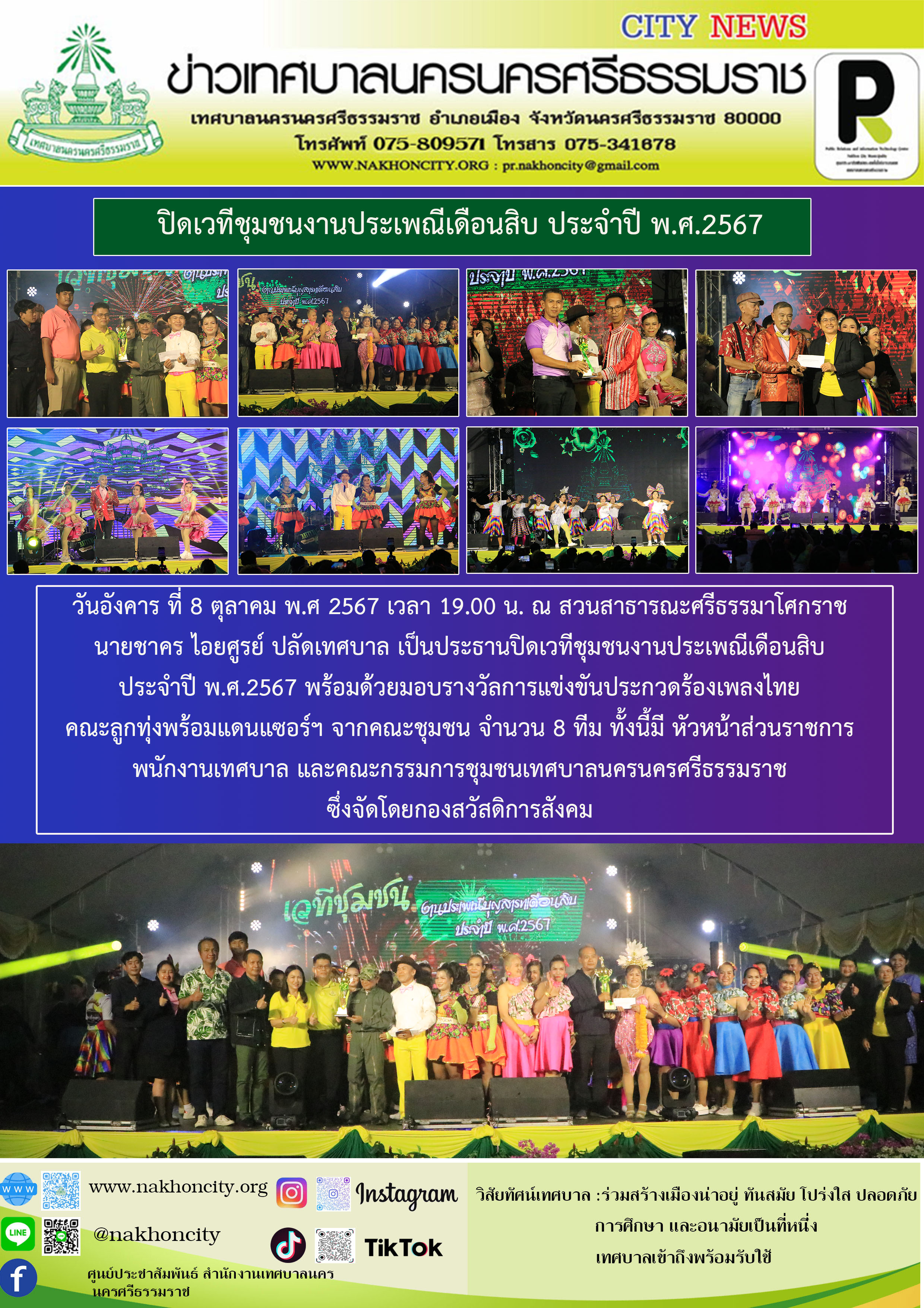 วันอังคาร ที่ 8 ตุลาคม พ.ศ 2567 เวลา 19.00 น. ณ สวนสาธารณะศรีธรรมาโศกราช นายชาคร ไอยศูรย์ ปลัดเทศบาล เป็นประธานปิดเวทีชุมชนงานประเพณีเดือนสิบ ประจำปี พ.ศ.2567 พร้อมด้วยมอบรางวัลการแข่งขันประกวดร้องเพลงไทยคณะลูกทุ่งพร้อมแดนแซอร์ฯ จากคณะชุมชน จำนวน 8 ทีม ซึ่งผลการประกวดร้องเพลงไทยลูกทุ่งพร้อมแดนเซอร์ คณะลูกทุ่งชุมชน งานประเพณีบุญสารทเดือนสิบ ประจำปี พ.ศ.2567 -รางวัลชนะเลิศ เงินรางวัล 25,000 บาท พร้อมถ้วยเกียรติยศได้แก่ ทีมแม่ทองพันชั่ง -รางวัลรองชนะเลิศ อันดับ 1 เงินรางวัล 20,000 บาท พร้อมถ้วยเกียรติยศ ได้แก่ ทีมกองทัพสายสัมพันธ์ -รางวัลรองชนะเลิศ อันดับ 2 เงินรางวัล 15,000 บาท พร้อมถ้วยเกียรติยศ ได้แก่ ทีมคนรักลูกทุ่ง -ร่างวัลชมเชย เงินรางวัล 8,000 บาท จำนวน 5 รางวัลได้แก่ ทีมสายสัมพันธ์ ทีมดอกชบา ทีมรวมดาว ทีมนงพงา และทีมใจเกินร้อย ทั้งนี้มี หัวหน้าส่วนราชการ พนักงานเทศบาล และคณะกรรมการชุมชนเทศบาลนครนครศรีธรรมราช ซึ่งจัดโดยกองสวัสดิการสังคม ภาพ//ข่าว//ไกรสิทธิ ตรวจทาน//ฐิตินันท์ |