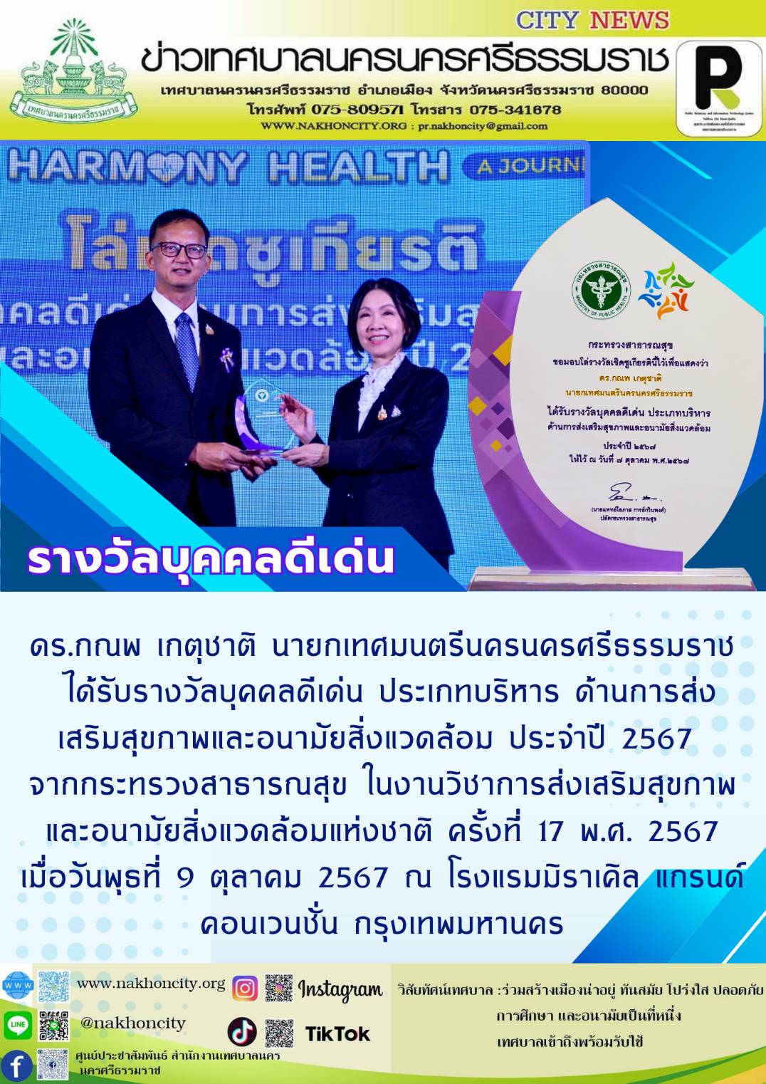 ดร. กณพ เกตุชาติ นายกเทศมนตรีนครนครศรีธรรมราช ได้รับรางวัลบุคคลดีเด่น ประเภทบริหาร ด้านการส่งเสริมสุขภาพและอนามัยสิ่งแวดล้อม ประจำปี 2567 จากกระทรวงสาธารณสุข ในงานวิชาการส่งเสริมสุขภาพและอนามัยสิ่งแวดล้อมแห่งชาติ ครั้งที่ 17 พ.ศ. 2567 เมื่อวันพุธที่ 9 ตุลาคม 2567 ณ โรงแรมมิราเคิล แกรนด์ คอนเวนชั่น กรุงเทพมหานคร |