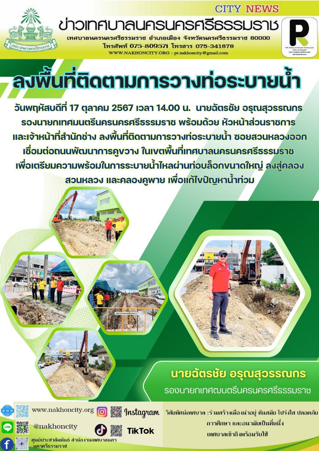 นายฉัตรชัย อรุณสุวรรณกร รองนายกเทศมนตรีนครนครศรีธรรมราช ลงพื้นที่ติดตามการวางท่อระบายน้ำ |