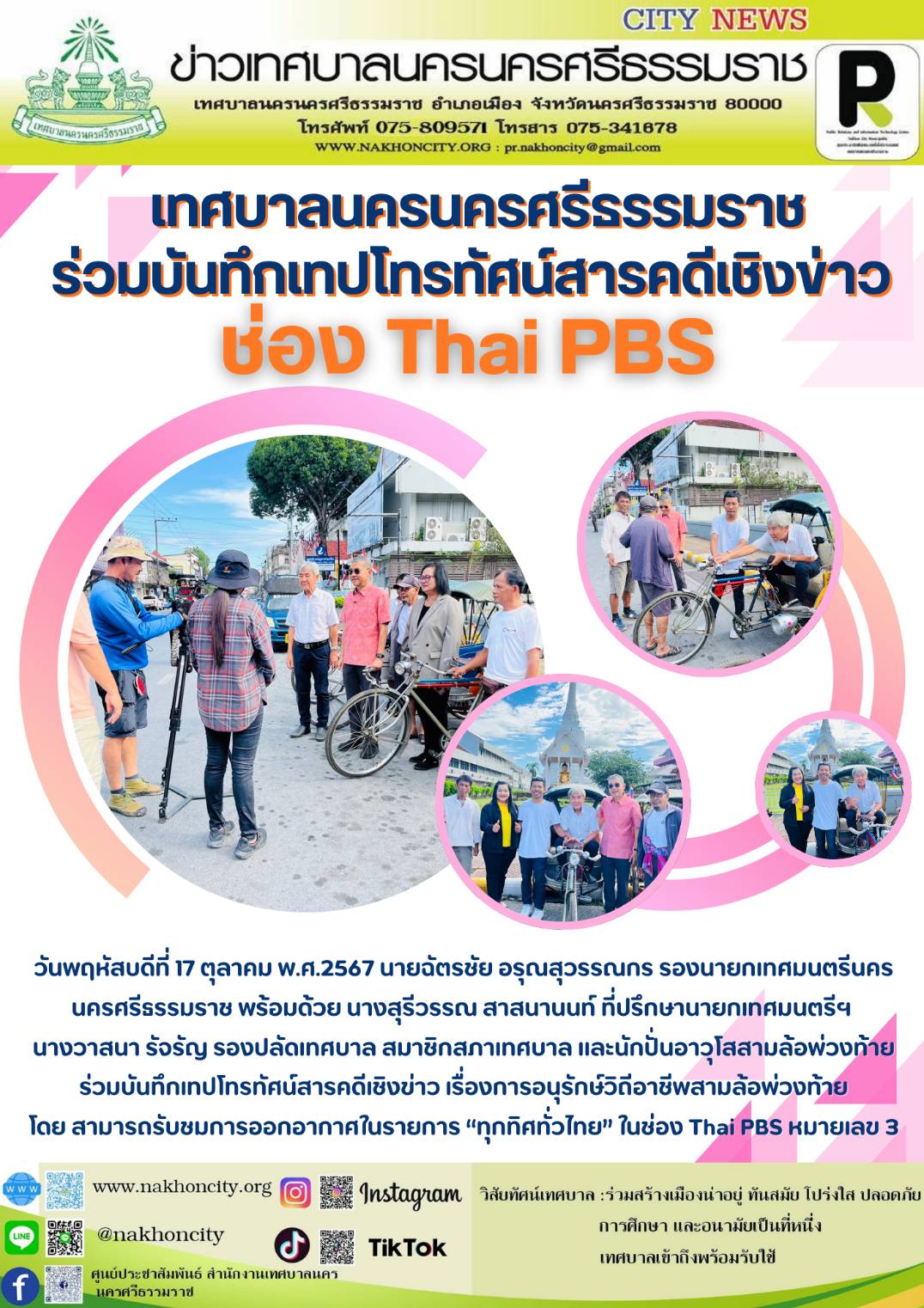 วันพฤหัสบดีที่ 17 ตุลาคม พ.ศ.2567 นายฉัตรชัย อรุณสุวรรณกร รองนายกเทศมนตรีนครนครศรีธรรมราช พร้อมด้วย นางสุรีวรรณ สาสนานนท์ ที่ปรึกษานายกเทศมนตรีฯ นางวาสนา รัจรัญ รองปลัดเทศบาล สมาชิกสภาเทศบาล และนักปั่นอาวุโสสามล้อพ่วงท้าย ร่วมบันทึกเทปโทรทัศน์สารคดีเชิงข่าว เรื่องการอนุรักษ์วิถีอาชีพสามล้อพ่วงท้าย โดย สามารถรับชมการออกอากาศในรายการ “ทุกทิศทั่วไทย” ในช่อง Thai PBS หมายเลข 3 .......... ข่าว//จันทร์จิรา |