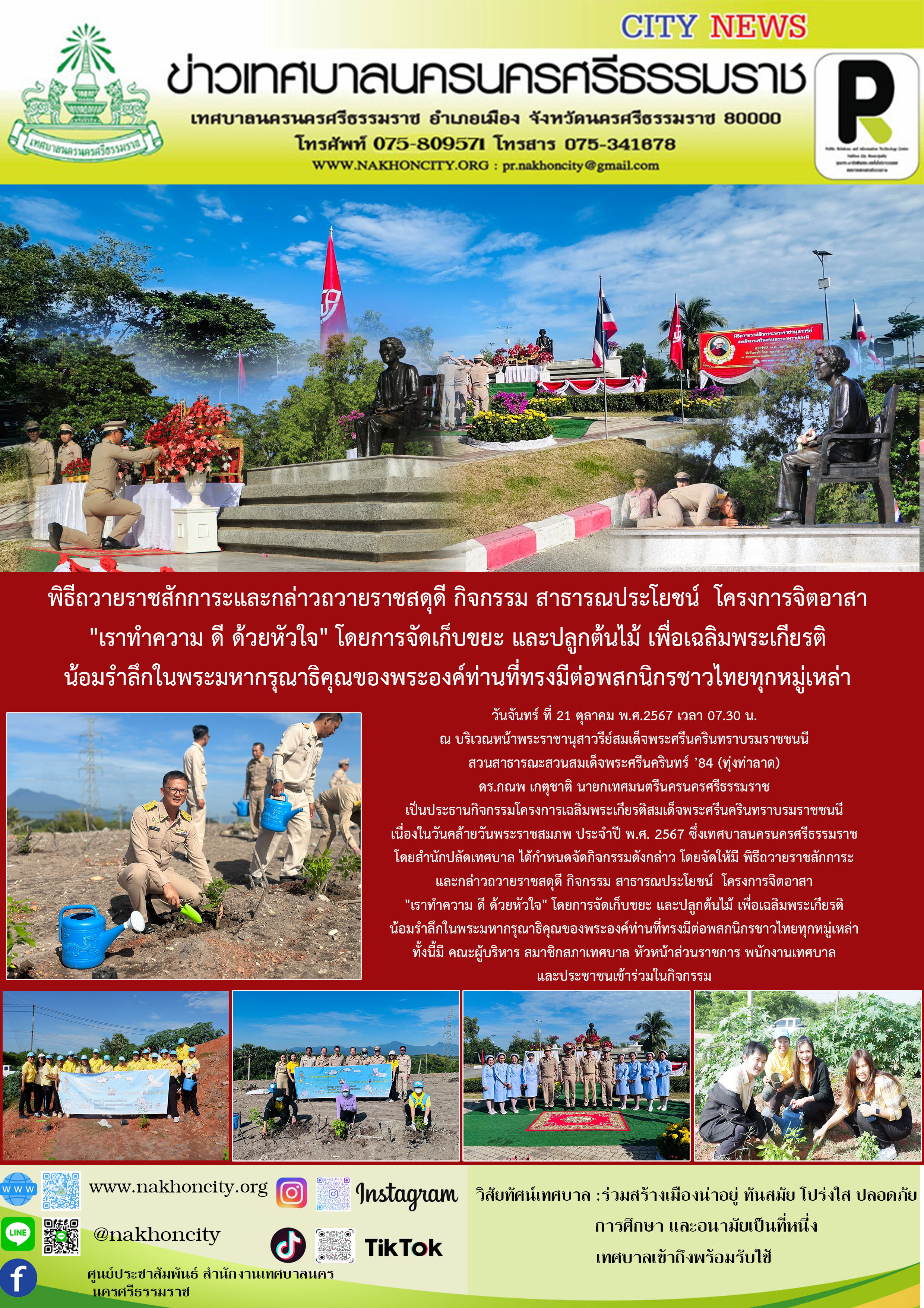 พิธีถวายราชสักการะและกล่าวถวายราชสดุดี กิจกรรม สาธารณประโยชน์ โครงการจิตอาสา "เราทำความ ดี ด้วยหัวใจ" โดยการจัดเก็บขยะ และปลูกต้นไม้ เพื่อเฉลิมพระเกียรติ น้อมรำลึกในพระมหากรุณาธิคุณของพระองค์ท่านที่ทรงมีต่อพสกนิกรชาวไทยทุกหมู่เหล่า |