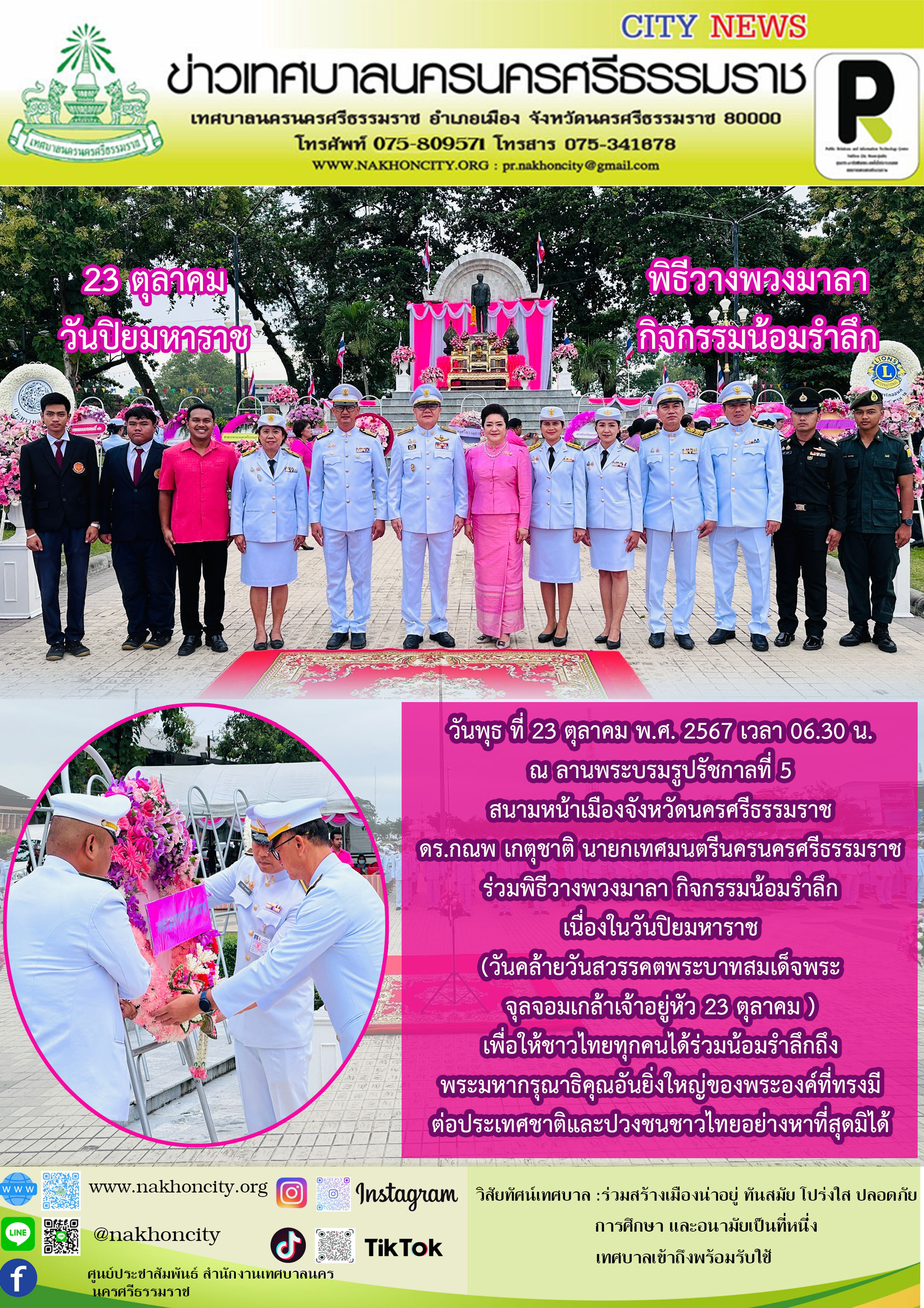 นายกเทศมนตรีนครนครศรีธรรมราช ร่วมพิธีวางพวงมาลา กิจกรรมน้อมรำลึก เนื่องในวันปิยมหาราช (วันคล้ายวันสวรรคตพระบาทสมเด็จพระจุลจอมเกล้าเจ้าอยู่หัว 23 ตุลาคม ) |