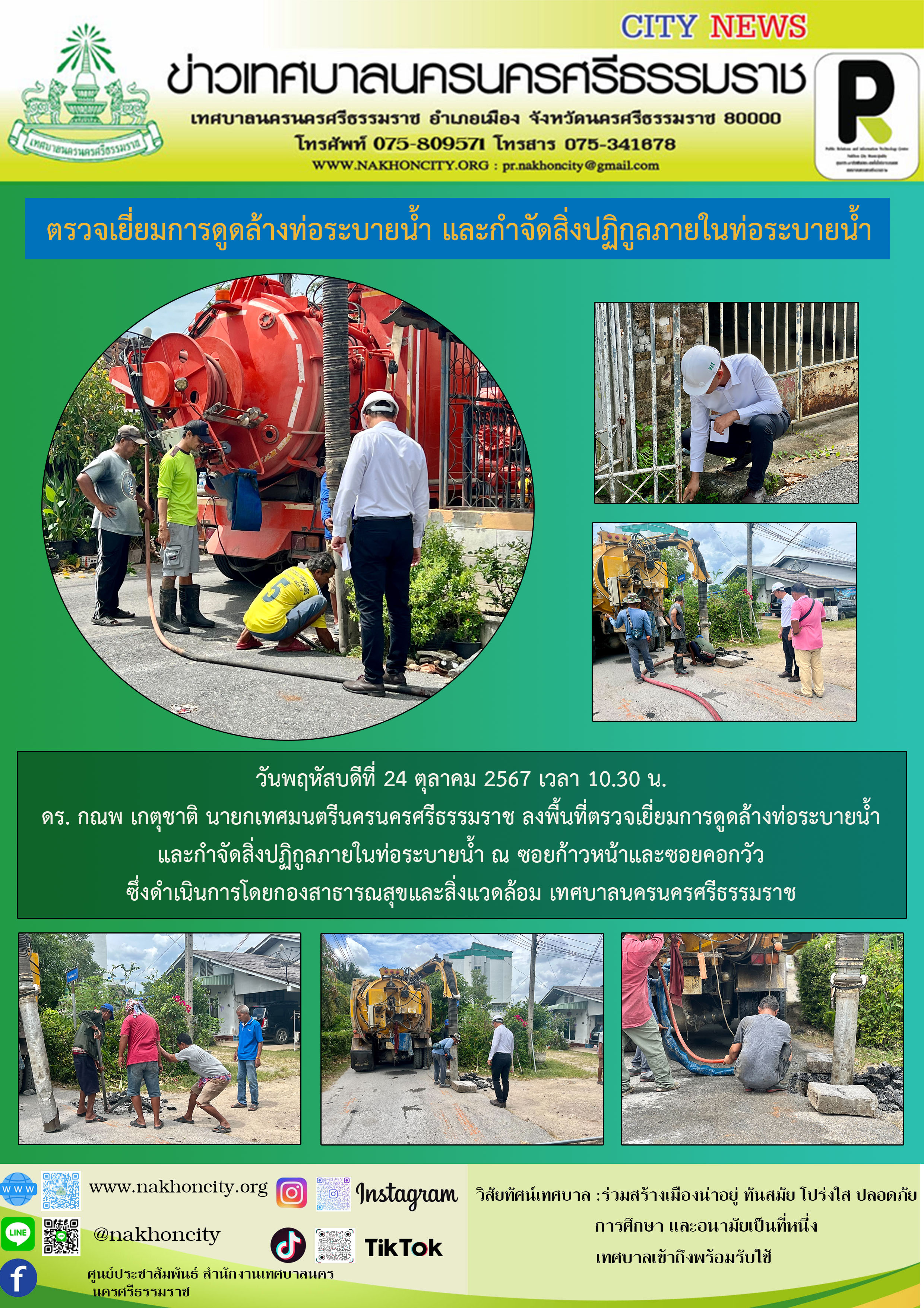 วันพฤหัสบดีที่ 24 ตุลาคม 2567 เวลา 10.30 น. ดร. กณพ เกตุชาติ นายกเทศมนตรีนครนครศรีธรรมราช ลงพื้นที่ตรวจเยี่ยมการดูดล้างท่อระบายน้ำและกำจัดสิ่งปฏิกูลภายในท่อระบายน้ำ ณ ซอยก้าวหน้าและซอยคอกวัว ซึ่งดำเนินการโดยกองสาธารณสุขและสิ่งแวดล้อม เทศบาลนครนครศรีธรรมราช |