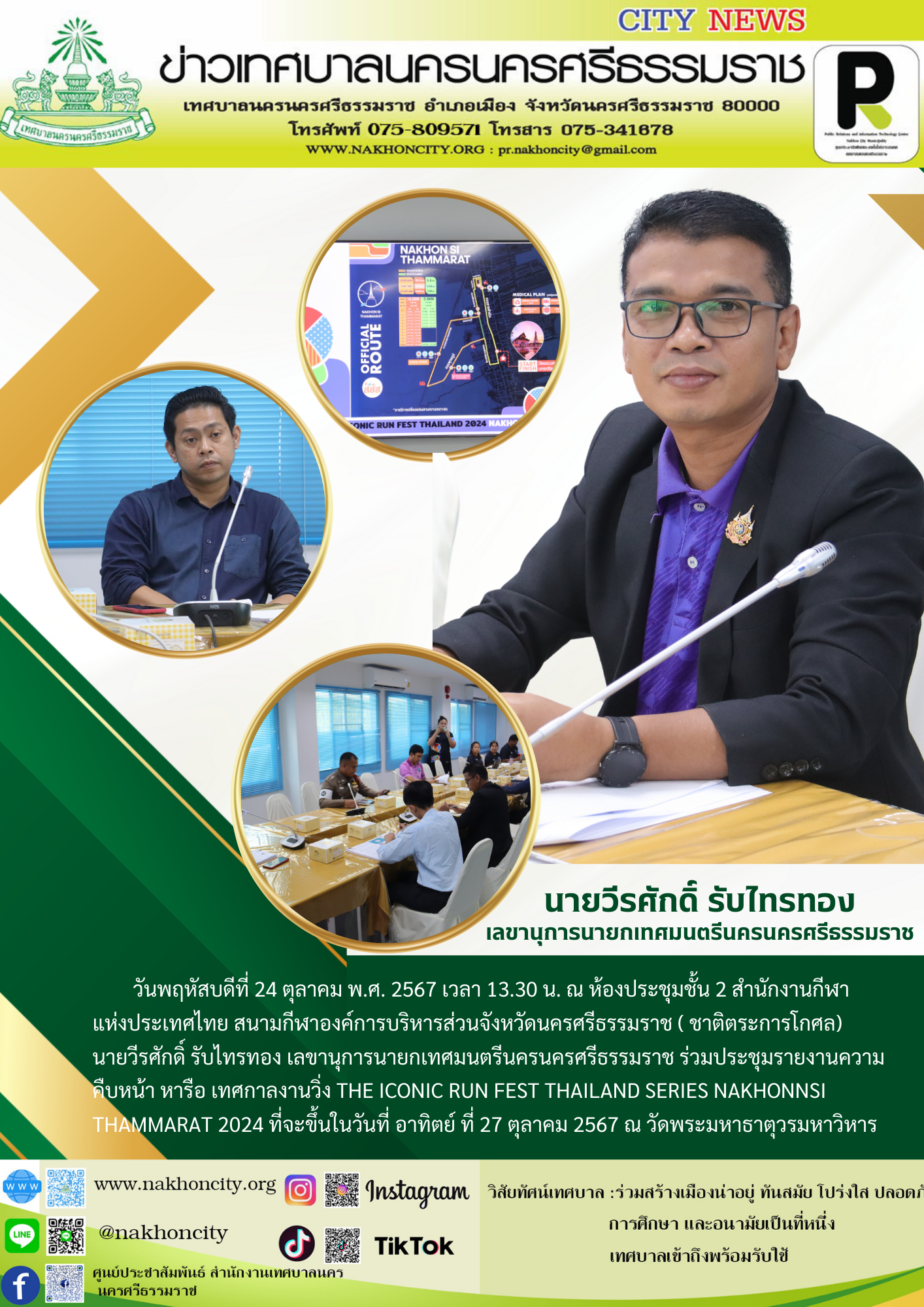 นายวีรศักดิ์ รับไทรทอง เลขานุการนายกเทศมนตรีนครนครศรีธรรมราช ร่วมประชุมรายงานความคืบหน้า หารือ เทศกาลงานวิ่ง THE ICONIC RUN FEST THAILAND SERIES NAKHONNSI THAMMARAT 2024 |