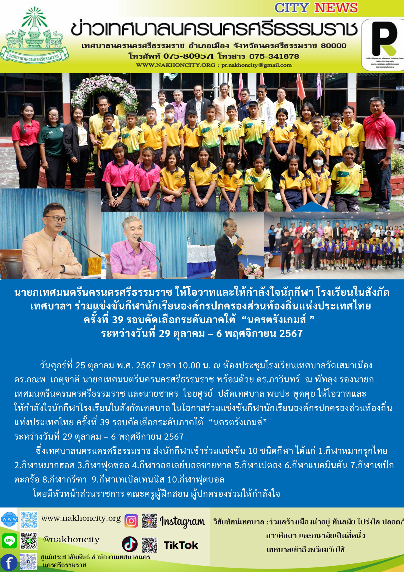 ดร.กณพ เกตุชาติ นายกเทศมนตรีนครนครศรีธรรมราช พร้อมด้วย ดร.ภาวินทร์ ณ พัทลุง รองนายกเทศมนตรีนครนครศรีธรรมราช และนายชาคร ไอยศูรย์ ปลัดเทศบาล พบปะ พูดคุย ให้โอวาทและให้กำลังใจนักกีฬาโรงเรียนในสังกัดเทศบาล ในโอกาสร่วมแข่งขันกีฬานักเรียนองค์กรปกครองส่วนท้องถิ่นแห่งประเทศไทย ครั้งที่ 39 รอบคัดเลือกระดับภาคใต้ “นครตรังเกมส์” |