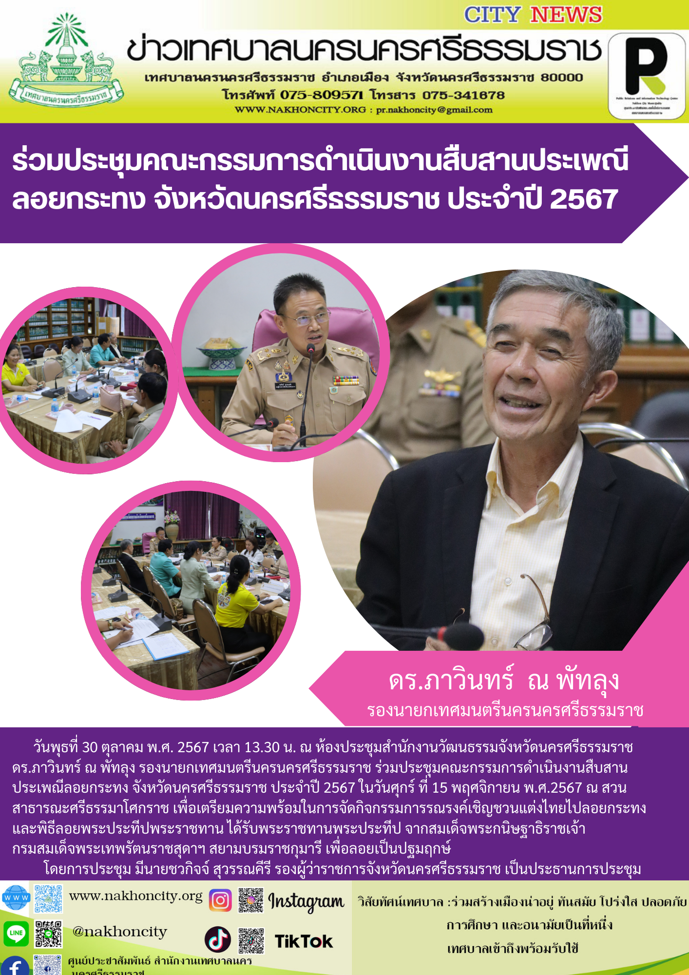 ดร.ภาวินทร์ ณ พัทลุง รองนายกเทศมนตรีนครนครศรีธรรมราช ร่วมประชุมคณะกรรมการดำเนินงานสืบสานประเพณีลอยกระทง จังหวัดนครศรีธรรมราช ประจำปี 2567 |