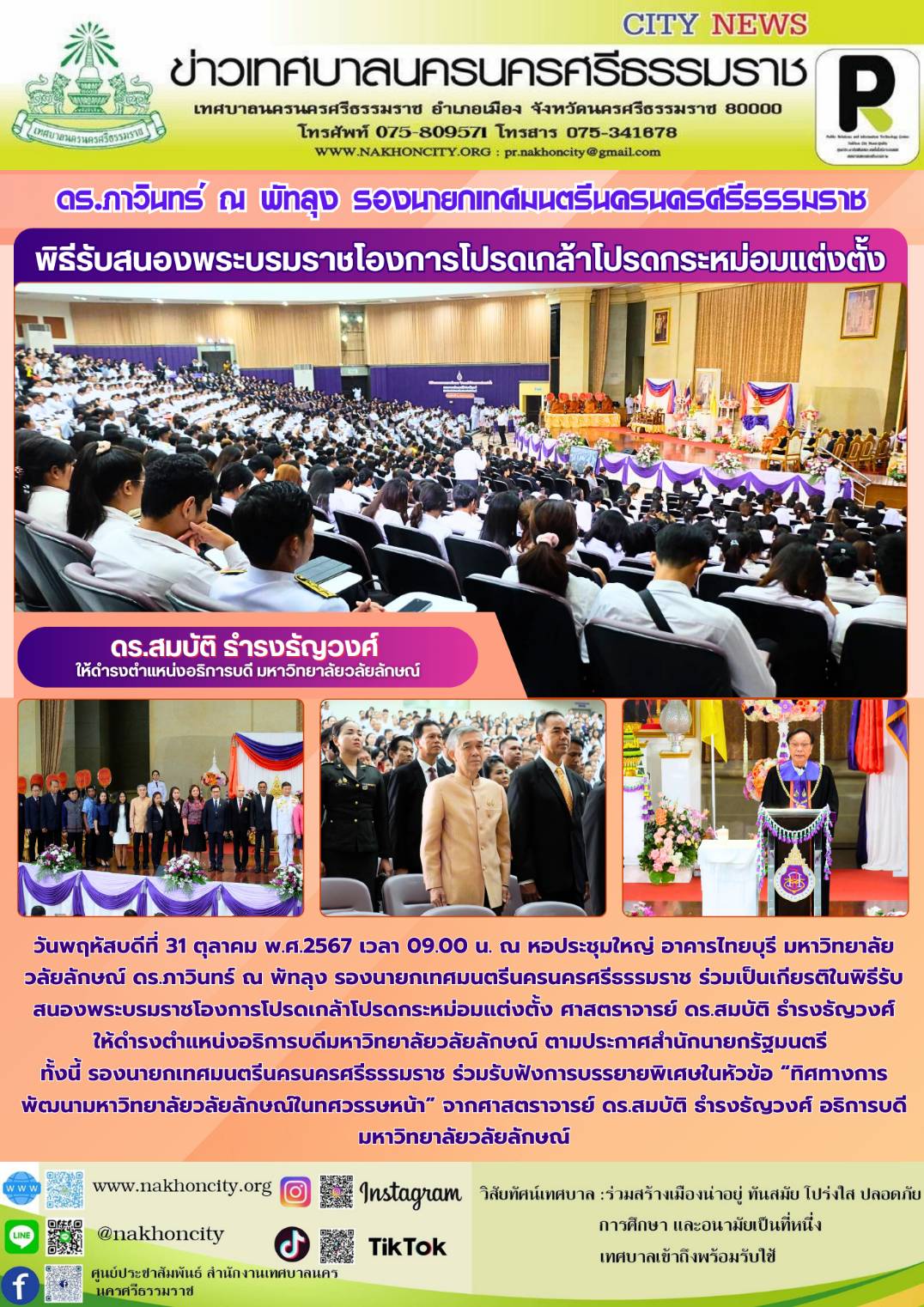 วันพฤหัสบดีที่ 31 ตุลาคม พ.ศ.2567 เวลา 09.00 น. ณ หอประชุมใหญ่ อาคารไทยบุรี มหาวิทยาลัยวลัยลักษณ์ ดร.ภาวินทร์ ณ พัทลุง รองนายกเทศมนตรีนครนครศรีธรรมราช ร่วมเป็นเกียรติในพิธีรับสนองพระบรมราชโองการโปรดเกล้าโปรดกระหม่อมแต่งตั้ง ศาสตราจารย์ ดร.สมบัติ ธำรงธัญวงศ์ ให้ดำรงตำแหน่งอธิการบดีมหาวิทยาลัยวลัยลักษณ์ ตามประกาศสำนักนายกรัฐมนตรี ทั้งนี้ เพื่อเป็นเกียรติและแสดงความยินดีและรับฟังการบรรยายพิเศษในหัวข้อ “ทิศทางการพัฒนามหาวิทยาลัยวลัยลักษณ์ในทศวรรษหน้า” จากศาสตราจารย์ ดร.สมบัติ ธำรงธัญวงศ์ อธิการบดีมหาวิทยาลัยวลัยลักษณ์ ................. ภาพ//ข่าว//จันทร์จิรา |